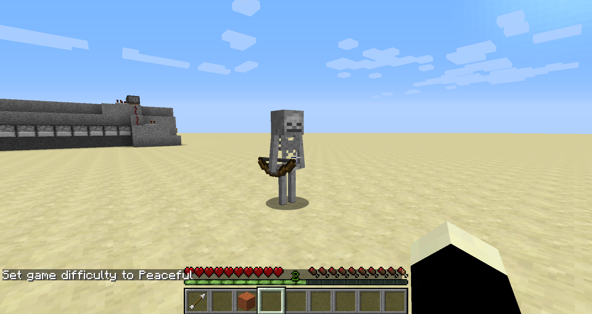 Upon opening a testing world a thunderstorm began. Upon setting weather to clear and watching the undead burn and bounce around oddly, I set my difficulty to peaceful. One skeleton refused to leave. I was able to punch him once before he became completely unresponsive. I tried cycling back through difficulties and even using a command instead, but the skeleton remained. I presume that he is a graphical bug and that reloading the game will cause him to vanish as he was intended to. Here is an image of my phantasmal friend.
