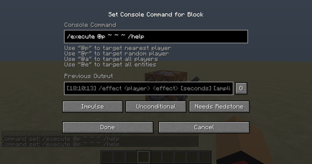 when you execute /execute @p ~ ~ ~ /help in a commandblock it shows the help from /effect
