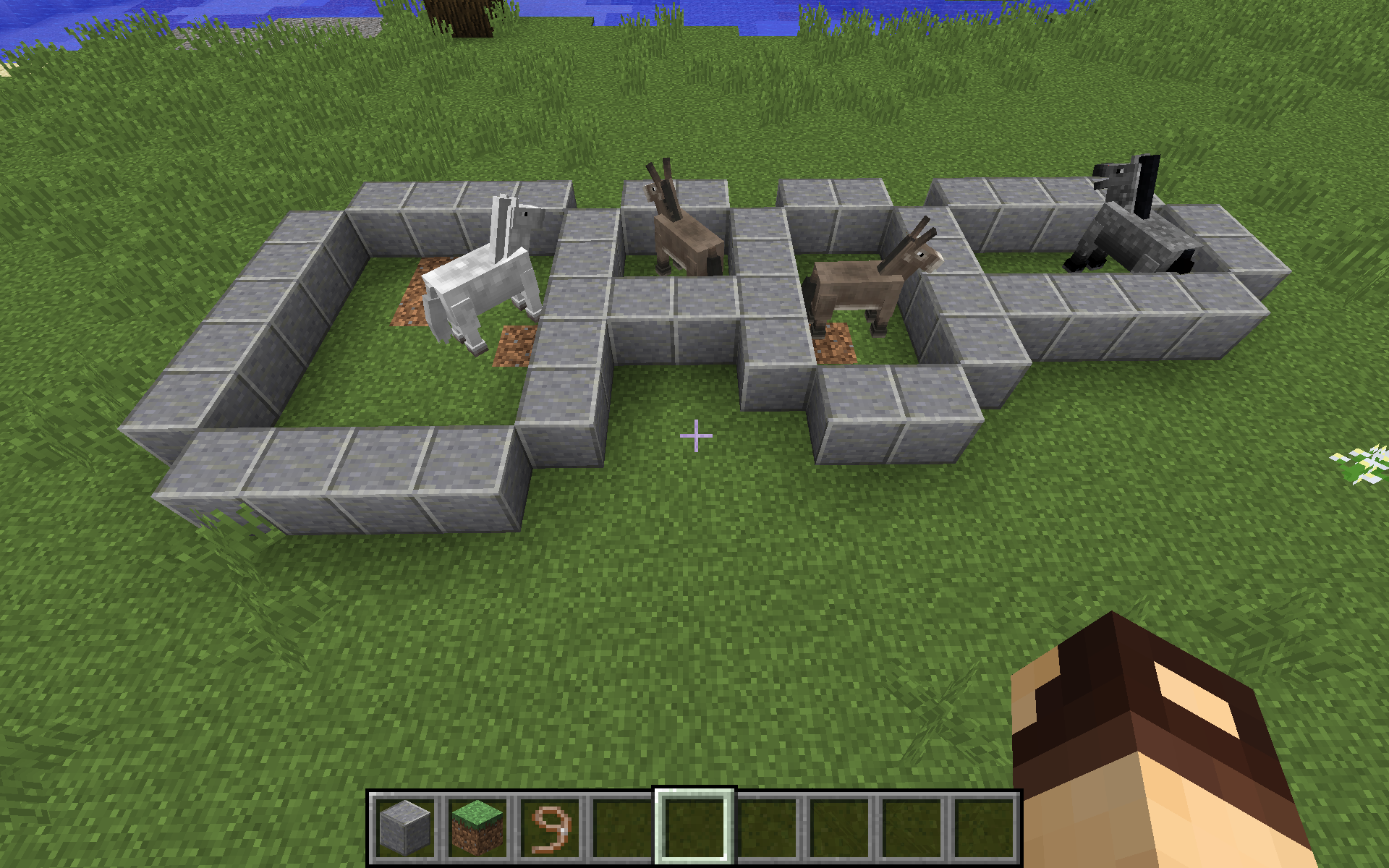 (See screenshot: "Corral Example", The two donkeys and the gray horse will never leave their 1 block high stone corral – but watch the white horse in the larger 4x4 area.)