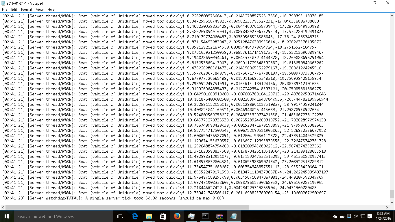 (Server) While players are in a boat, every few seconds the server spams hundreds of messages a second, causing the server to immediately freeze, and commonly shut down.