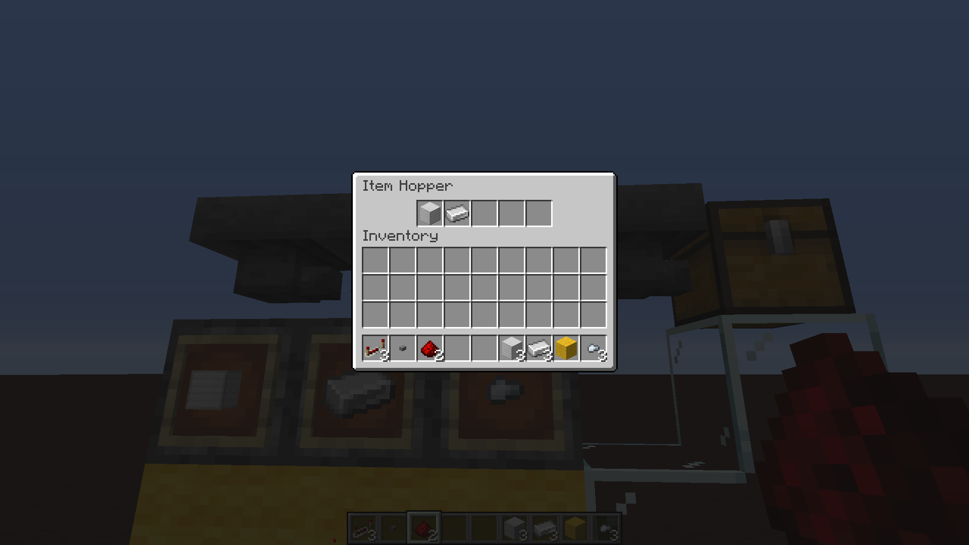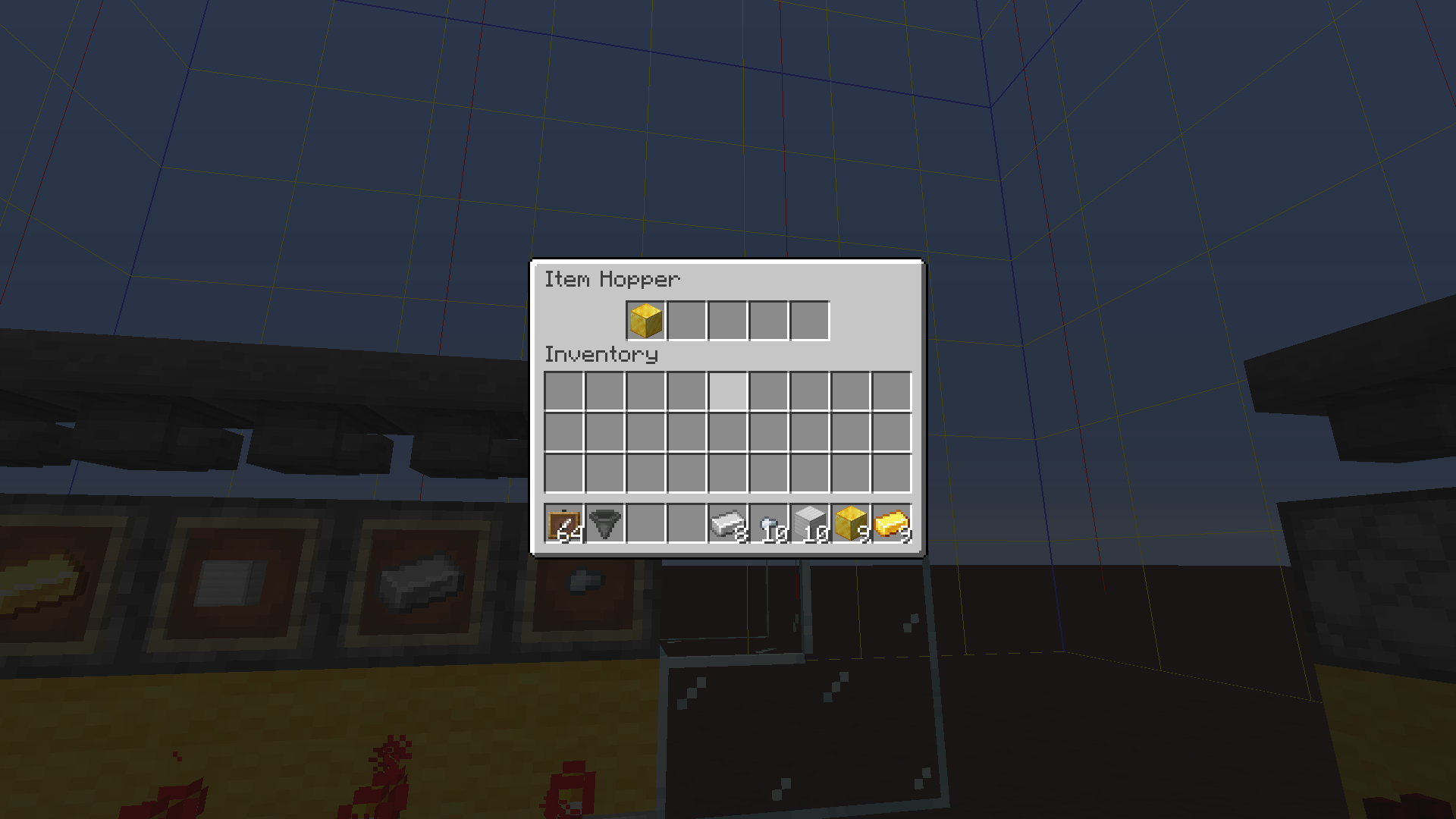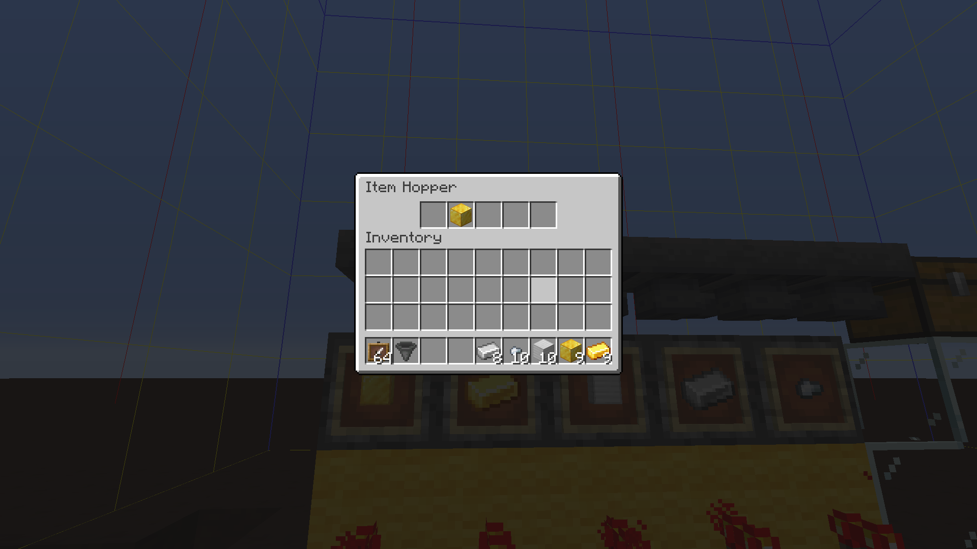 Item teleportation: In another test with 5 droppers, relogging resulted in 4 of the hoppers being glitched (having their item in the 2nd slot). Just before the next hopper cooldown expires, the hopper above the gold ingot dropper contains a gold block ready to be pushed [7th screenshot]. On the very next tick, the block is teleported into the last hopper in the row, completely skipping 3 hoppers in between. [8th screenshot]