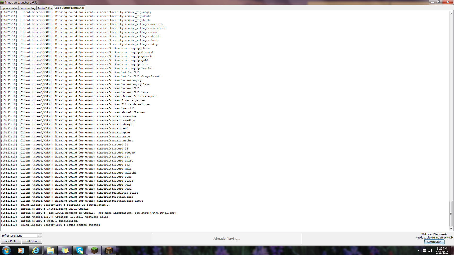 Sound library missing from snapshots version 16w04 and upwards, even if snapshot was released before that week.