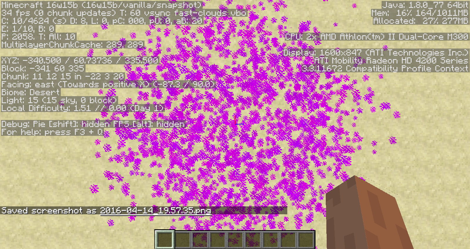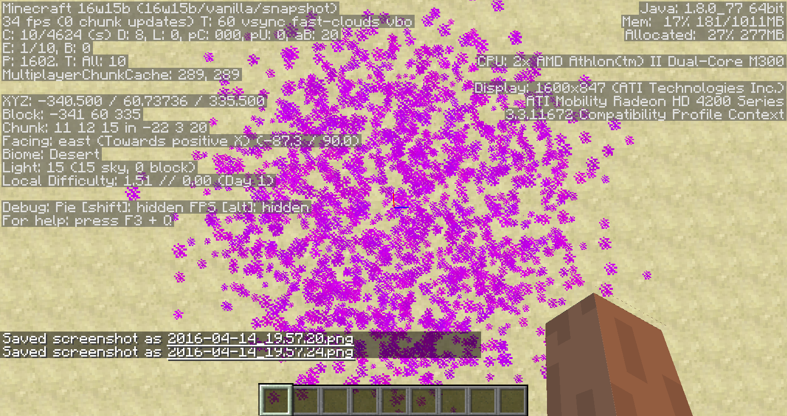 In the boss fight with the ender dragon, the dragon periodically shoots an area of effect attack that generates excessive particles. These particles seem to cause a very considerable performance hit. When using reduced and minimal particle settings, the particles vanish and performance returns to normal, however, the area of effect attack becomes invisible.