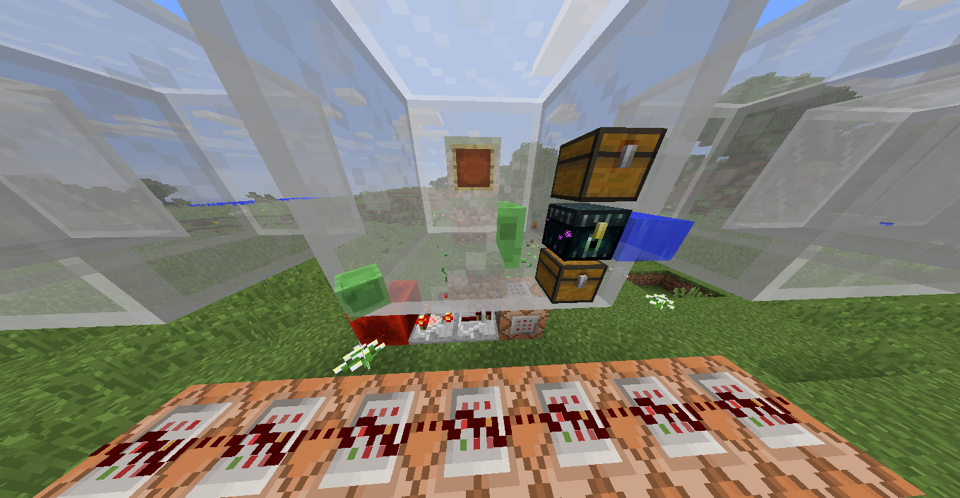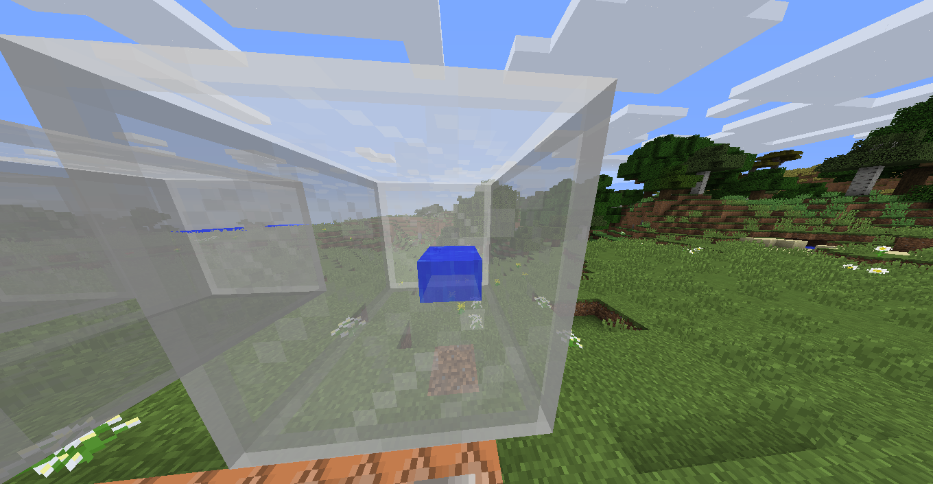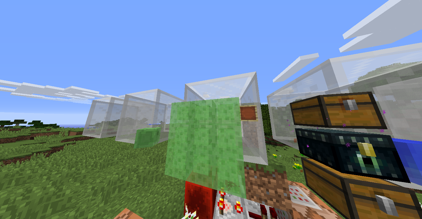 Water, chests, item, particles, all the entities and slime blocks are rendered in front of semi trasparent blocks placed in the mobs' head slot in 1.8.9 and 1.9 snapshots, i don't know in older versions