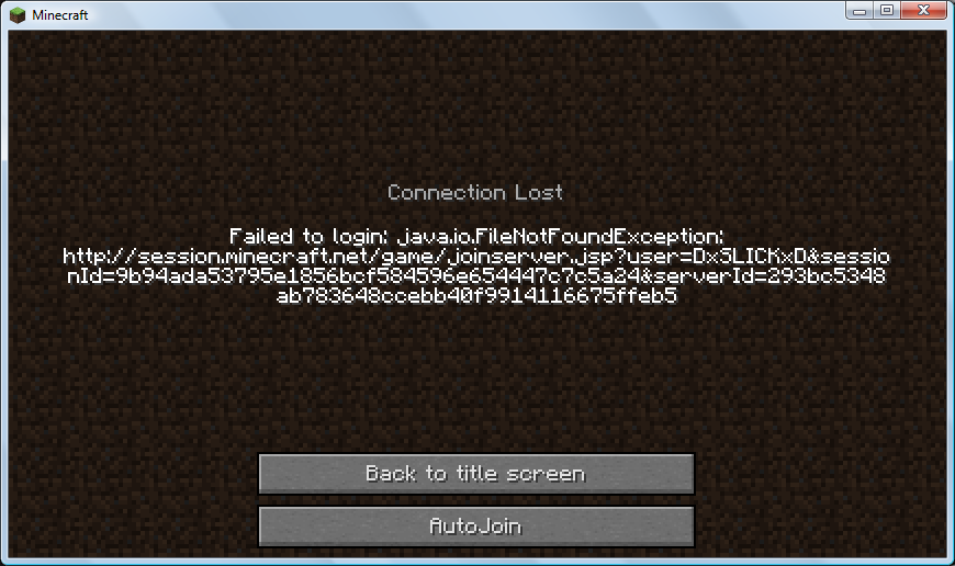 I can't join any server or make my own and join it it keeps on saying the annoying message Failed to Login: java.io.FileNotFoundException:http://session.minecraft.net/game/joinserver.jsp?user=DxSLICKxD&sessionId please someone help me i wanna play in servers