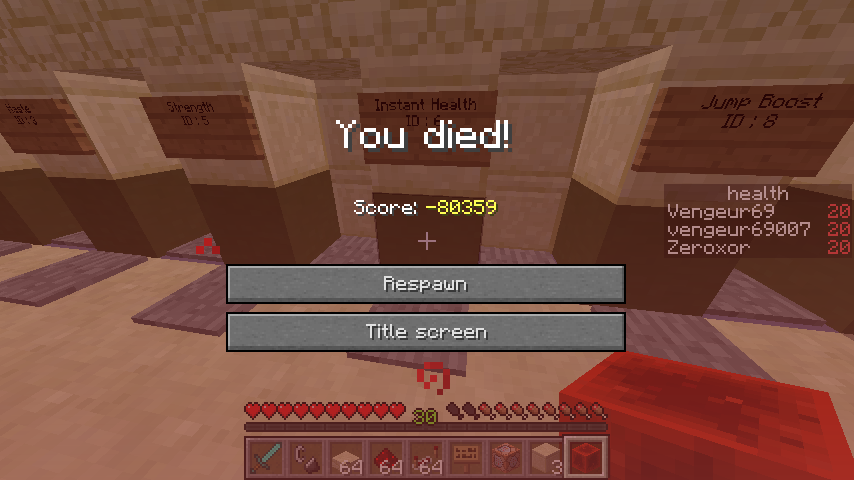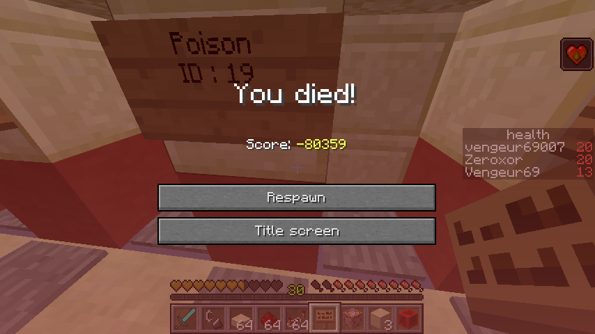 When I am full life, I remove the Instant Health effect, and then I remove the item from my hand, and finally apply poison, it will give me a fake death screen.