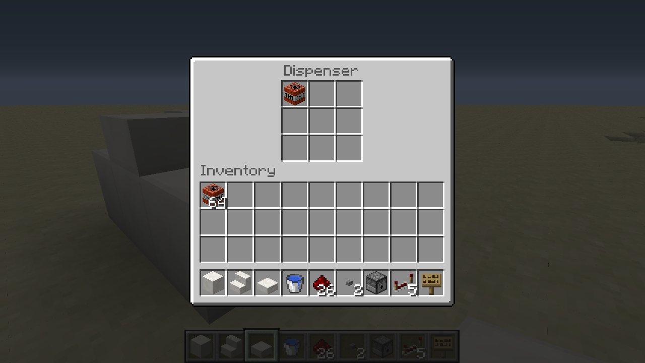 1 - TNT dispensed into solid block with water above which it should move into, stopping the explosion from damaging blocks. Entire apparatus blows up. (Pictures 1-3)
