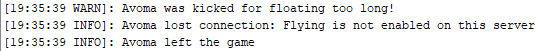 [17:54:58] [Server thread/WARN]: Jobe was kicked for floating too long!Code analysis