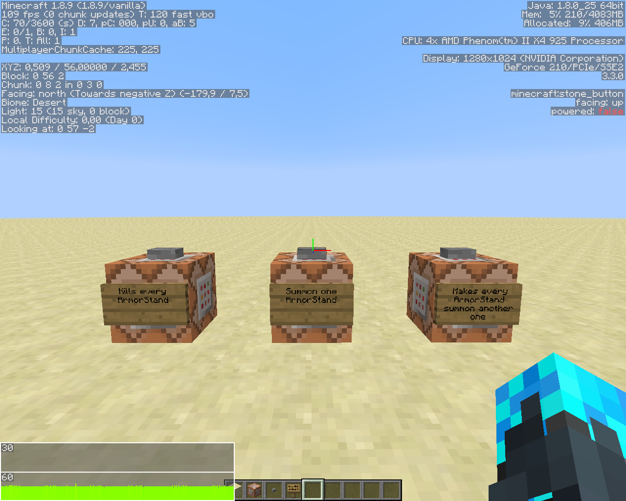 So for each version, I first activate the second Command Block (so 1 ArmorStand spawn). After what I activate the third Command Block many times, so the number of ArmorStand increase like 2^n.