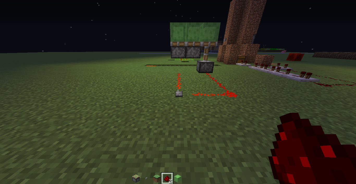 If you place three pistons in a row (all facing up) and place slime blocks on top of them, when both the left and right pistons are powered, one of the pistons stays on the ground and the other two (along with the slime blocks) are lifted up in the air. It seems that which piston stays on the ground should depend on where the power is placed, and this is true. However, the piston on the right seems to stay on the ground more often than the left. This means that 2/3 time you place the button in a random spot, the right one will get powered.