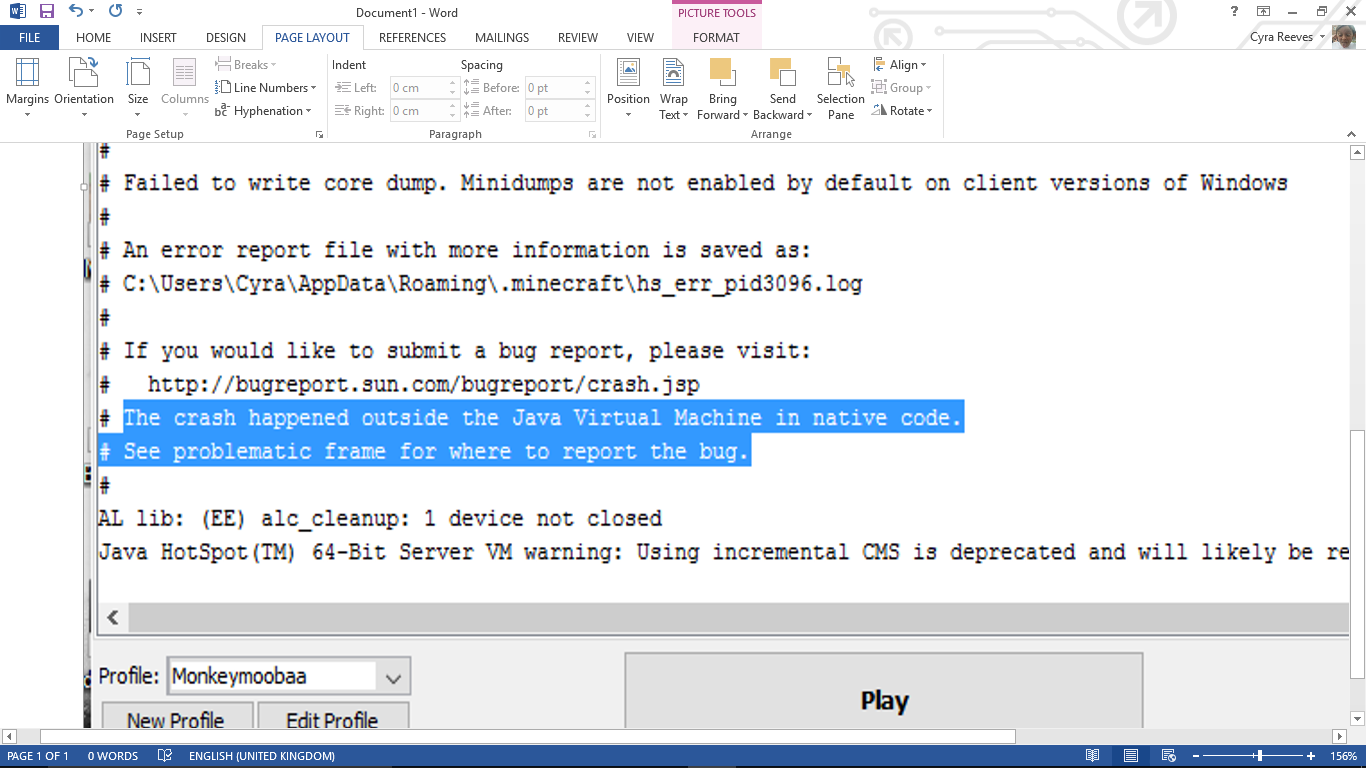 What actually happened was I got kicked out the game and it game up with this input saying it is due to a problem from outside the java from a native code.