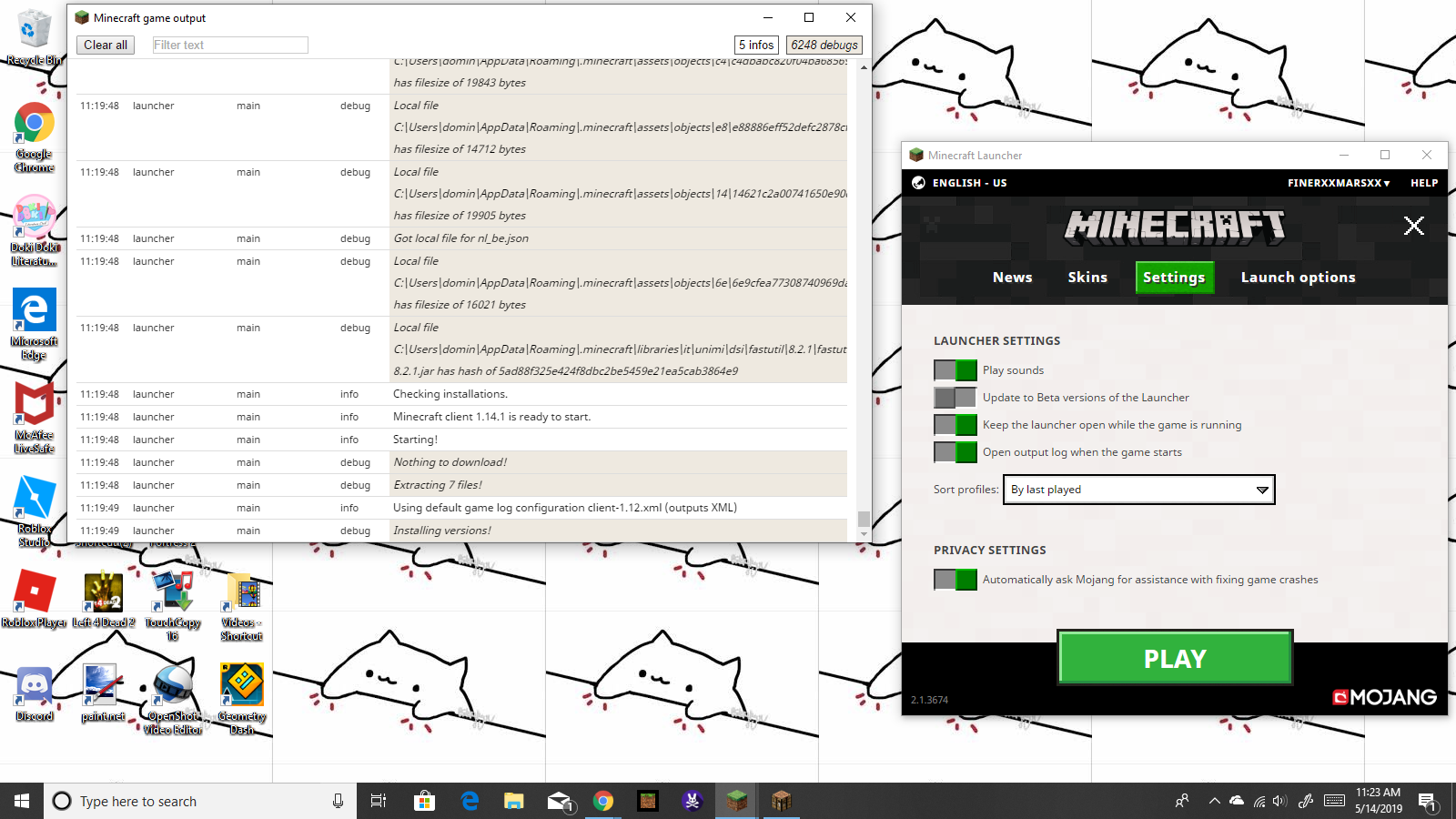 During the loading process of 1.14 and 1.13.2 (tried using a different version) my minecraft crashes during the Mojang loading screen.