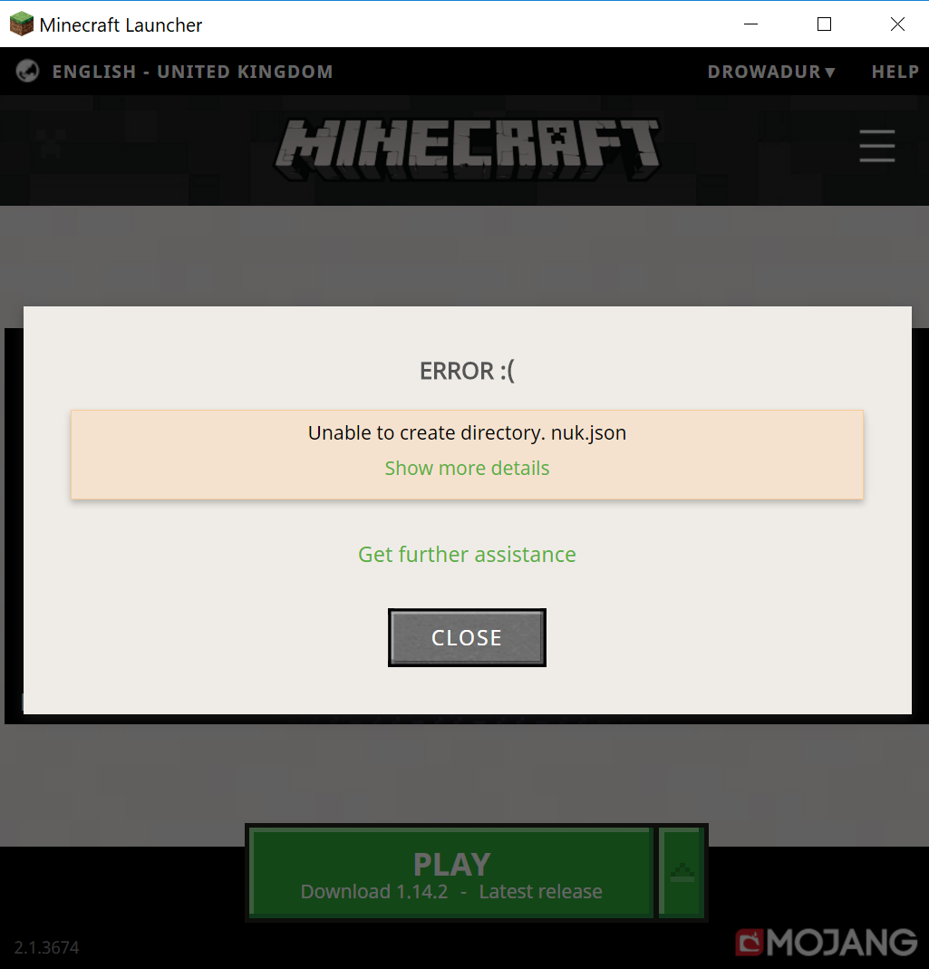 Whenever i try to launch minecraft with the launcher I get this error message: Unable to create a directory. nuk,json.