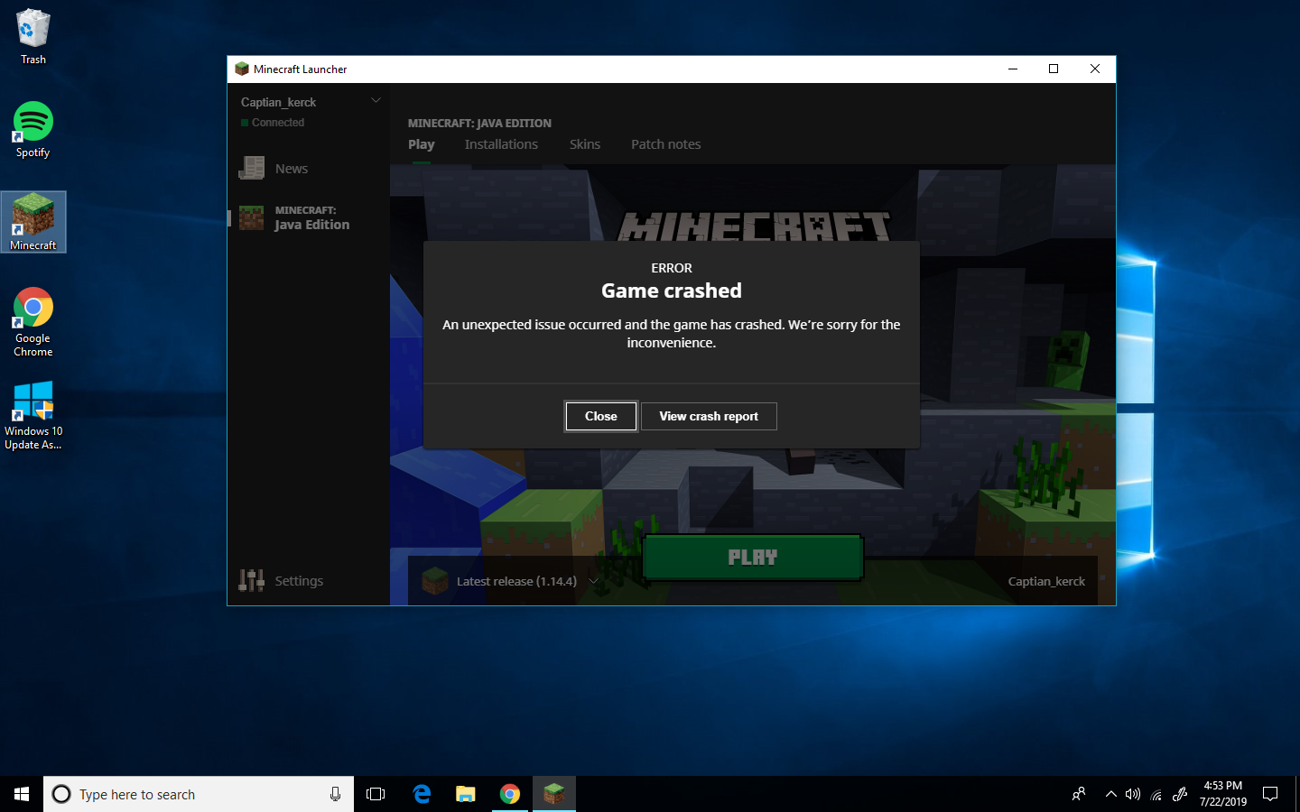I've been having all types of issues loading Minecraft. I updated to the newest Windows 10 and I was able to play for like 3 or 4 minutes. Then it crashed. I tried to play again and it would load up to about 50% on the Mojang loading screen and then stop for a few seconds then continue up to 80% and then stop again then go up to 90% and then crash. then the launcher would load up and give me the option to view the crash report, but when I try to open it nothing happens I've uninstalled and re-installed Minecraft a couple of times now.