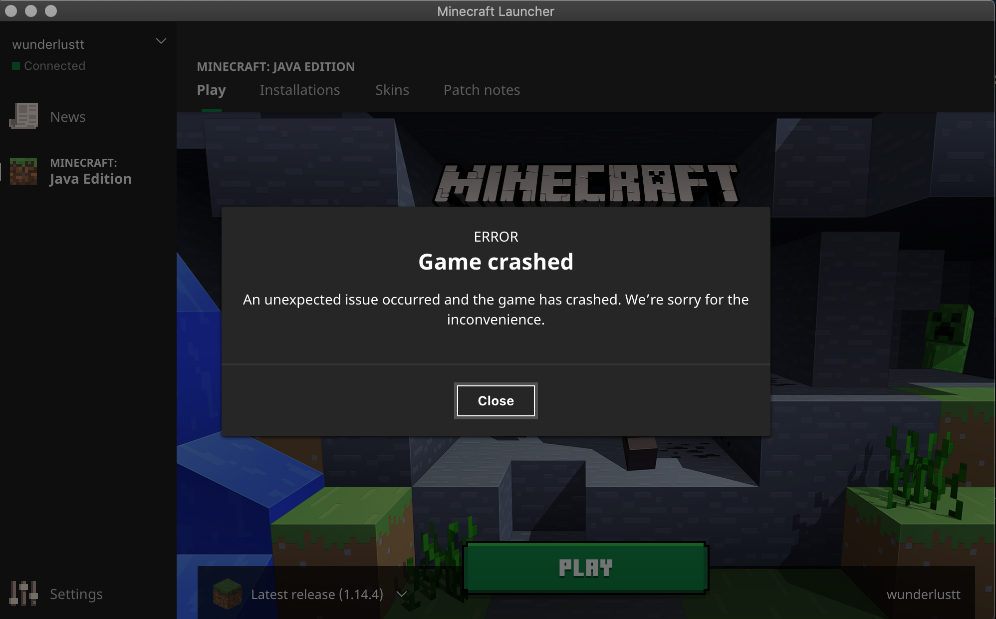 Also getting same exact error. Sometimes closing the error notification box, clicking "Play" again, and then clicking "don't reopen" in the java dialog that opens after that will get the game to start. But sometimes it just happens over and over, and the only way that seems to fix it is a full restart of the Mac.
