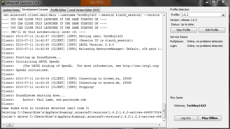 Play button says "Play Offline" when I select 1.6.2 and Play button says "Play" when I select Snapshots or mods.