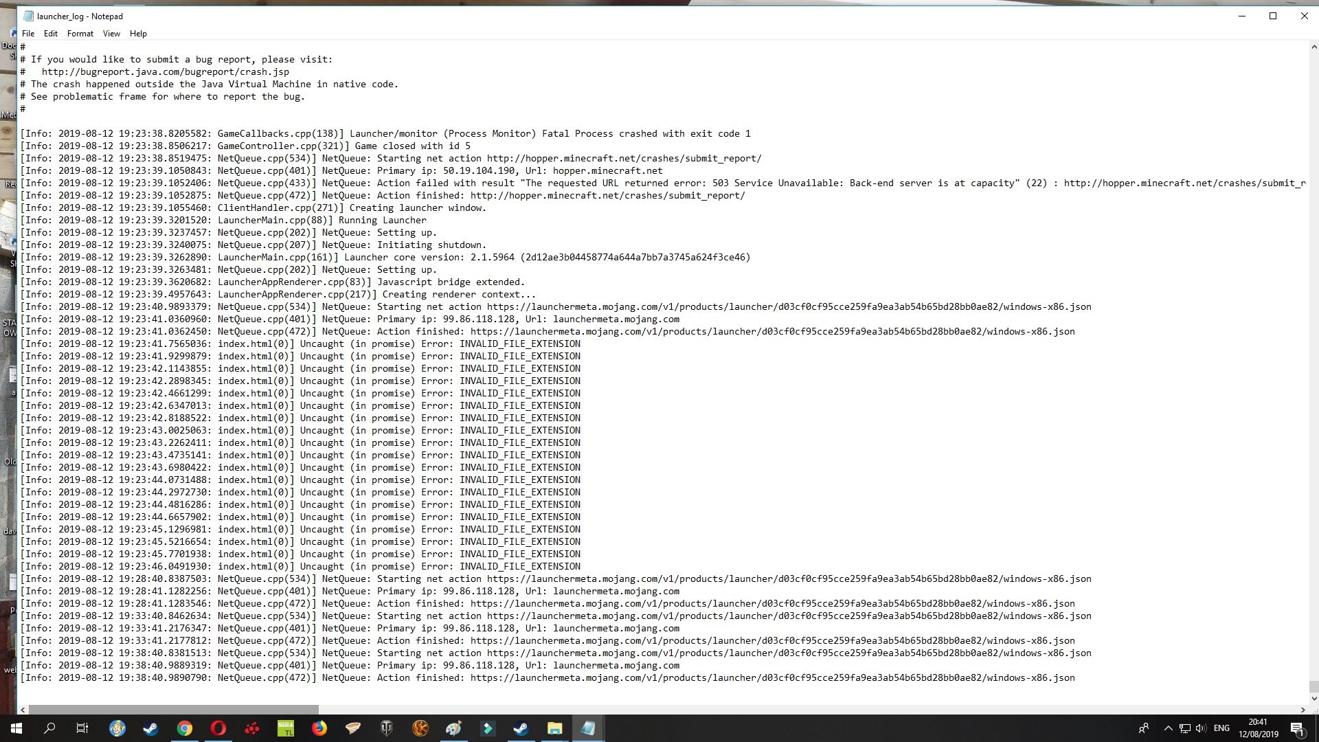 If you cannot find a crash report, please attach the full launcher log found in [minecraft/launcher_log.txt|http://hopper.minecraft.net/help/guides/finding-minecraft-data-folder/].