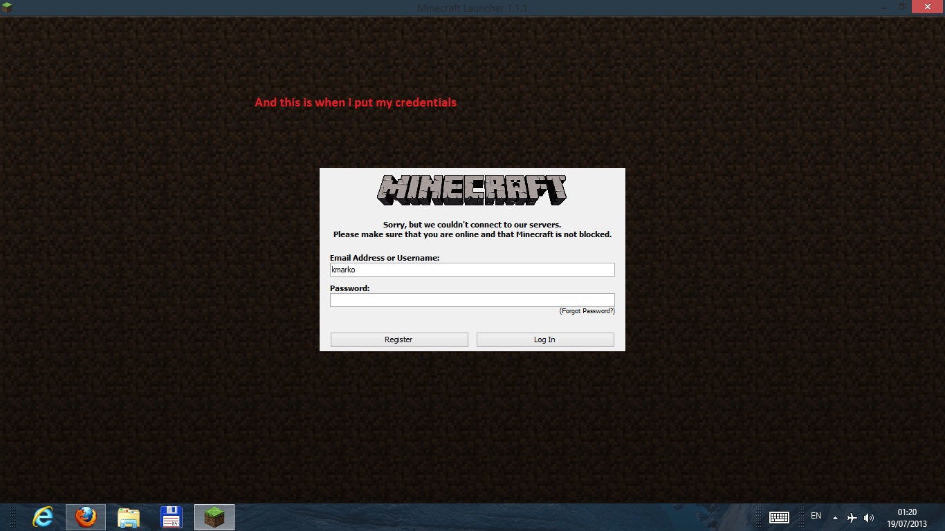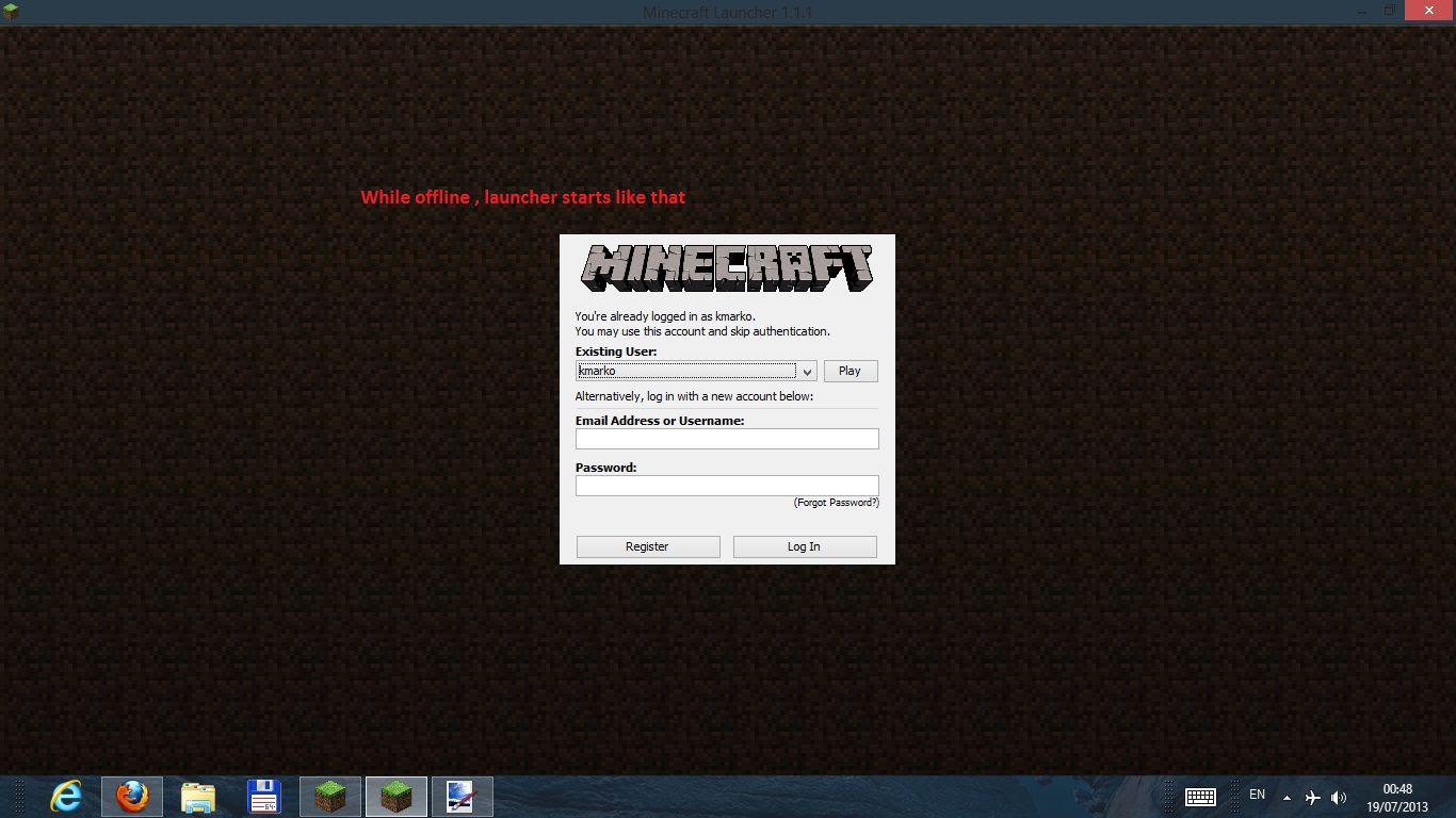 I don't have Internet, so I tried to play Minecraft offline, but the game launcher version 1.1.1 won't let me log in without Internet, so I cannot play offline! Fix this bug, please, because I hardly ever can have access to the Internet!