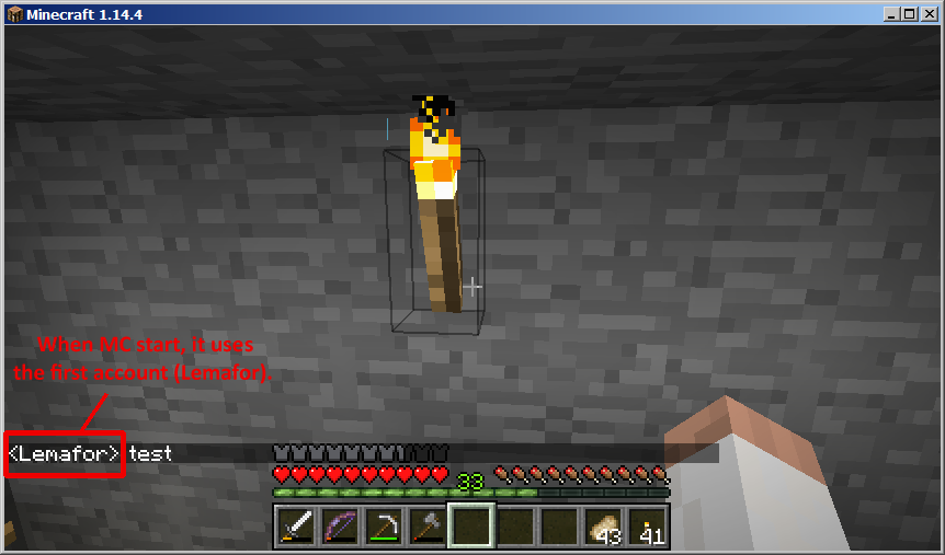 I have two accounts (premium) - "Lemafor" and secret (I don't want to publish the name of the second account). When I try to change the account to the second account all is OK in the launcher. But after start I see that MC uses the first account (Lemafor) - both in SP and multiplayer.