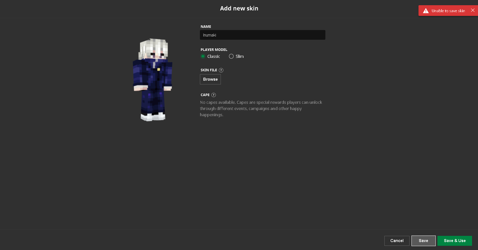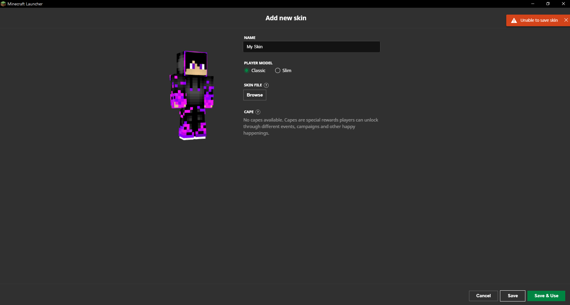 Every time I try to create a skin profile for the launcher 2.1.9616, the skins can be saved or duplicated. There would be an error message on the top right corner saying "Unable to duplicate skin" or "Unable to save skin".