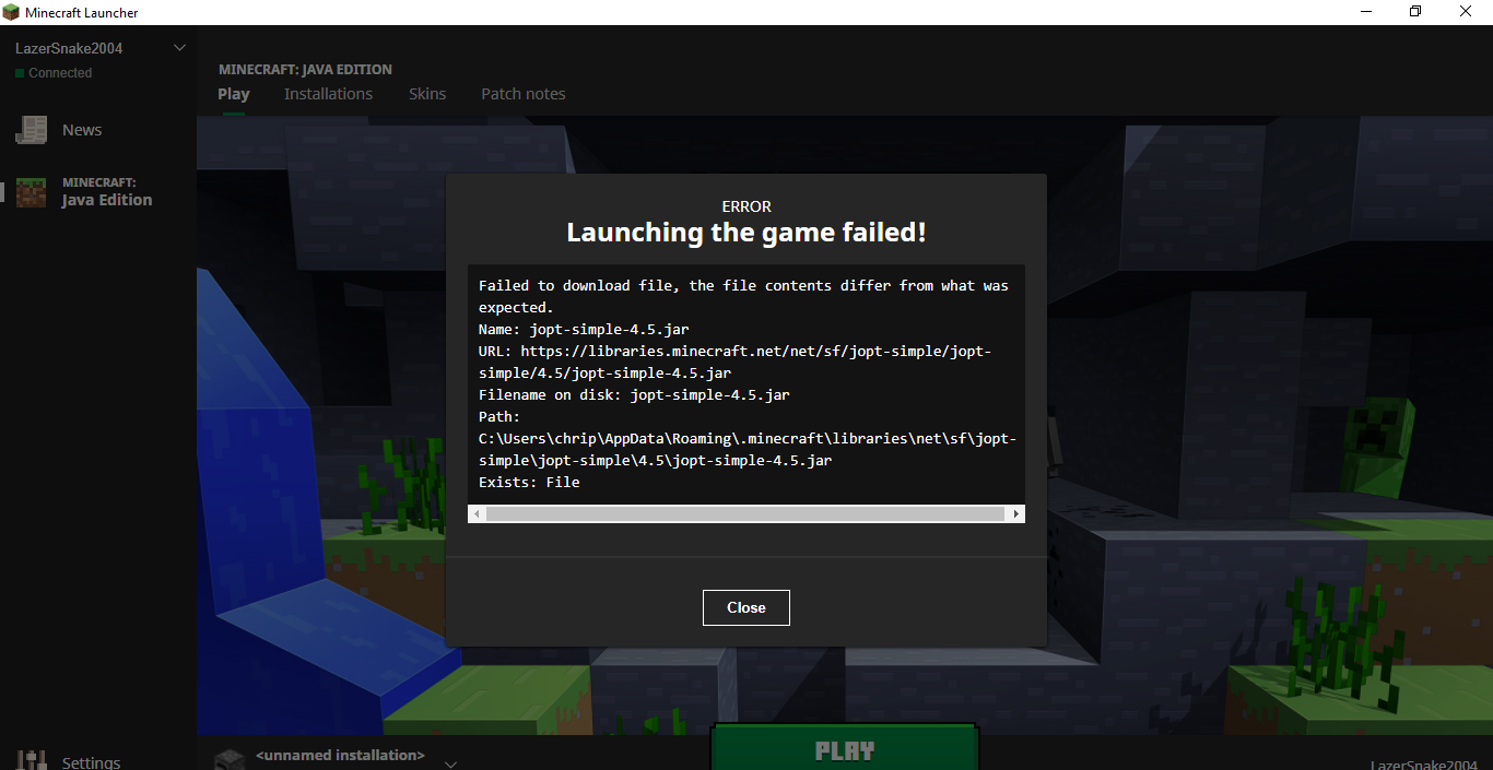 My Launcher is having problems when I try to play the game it loads and then a error pops up and says failed to download file, the file content differ from what was expected