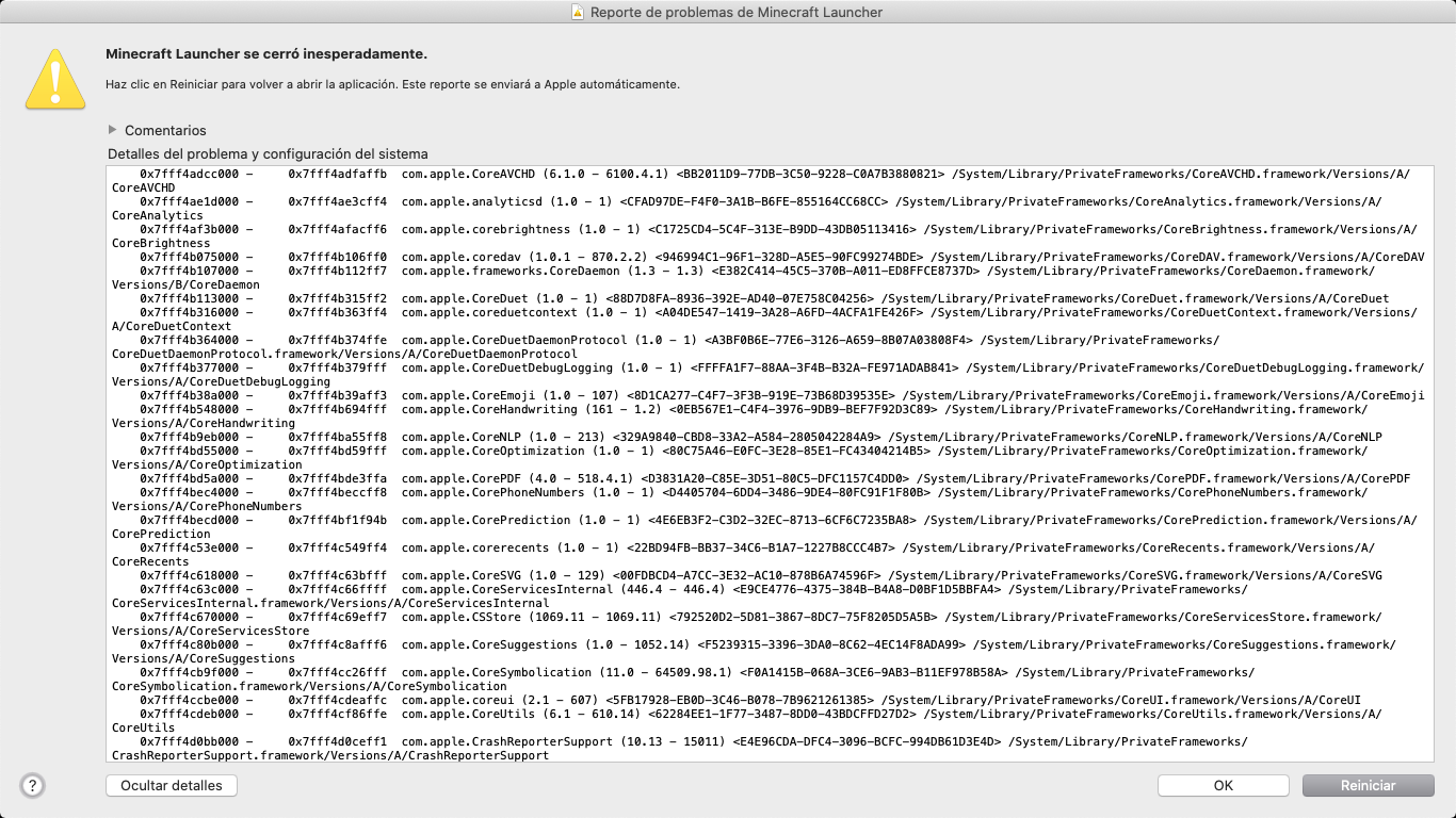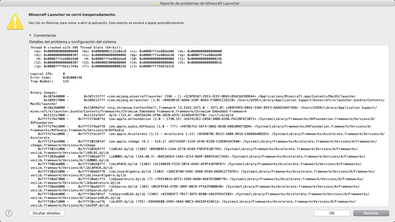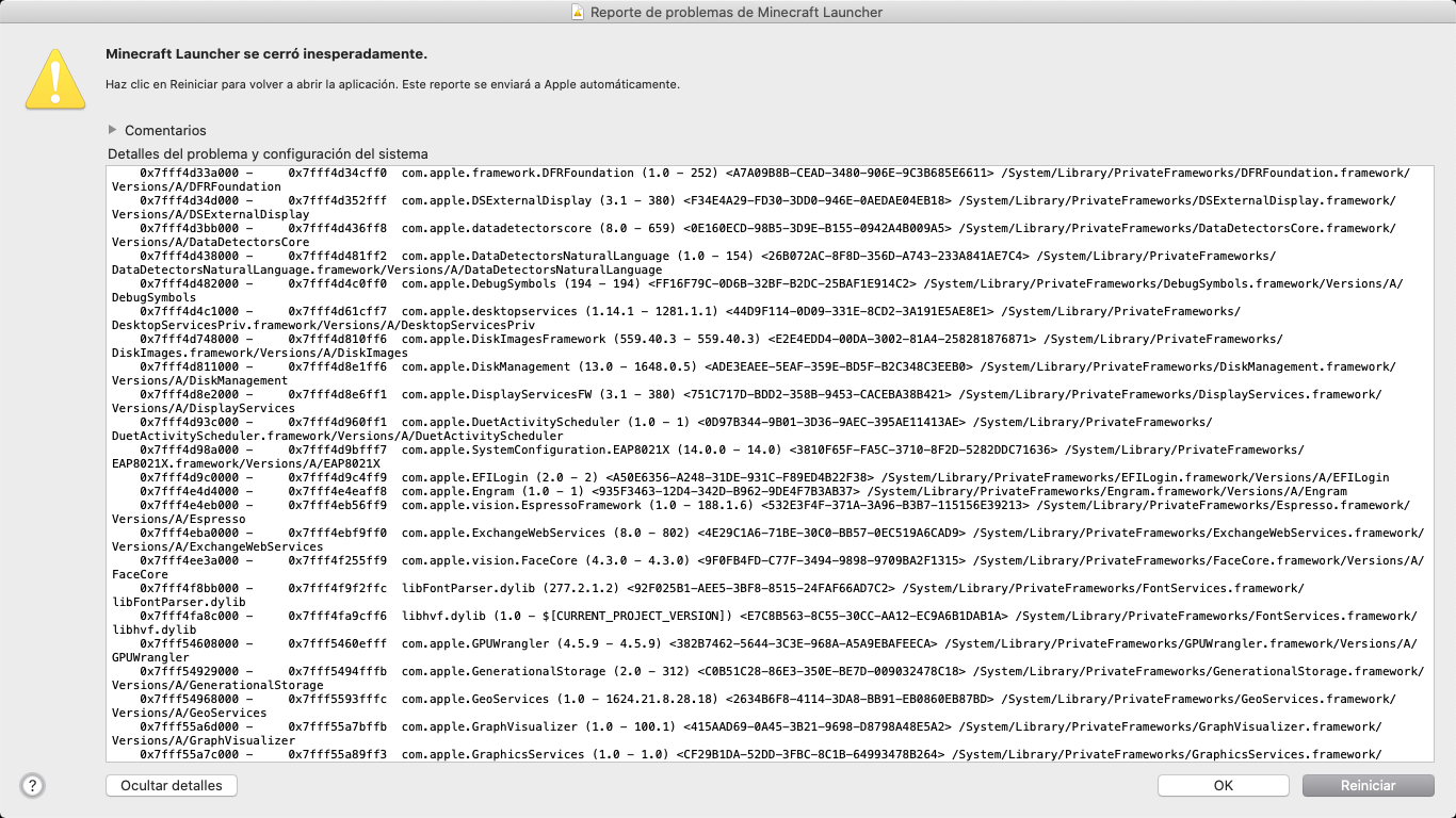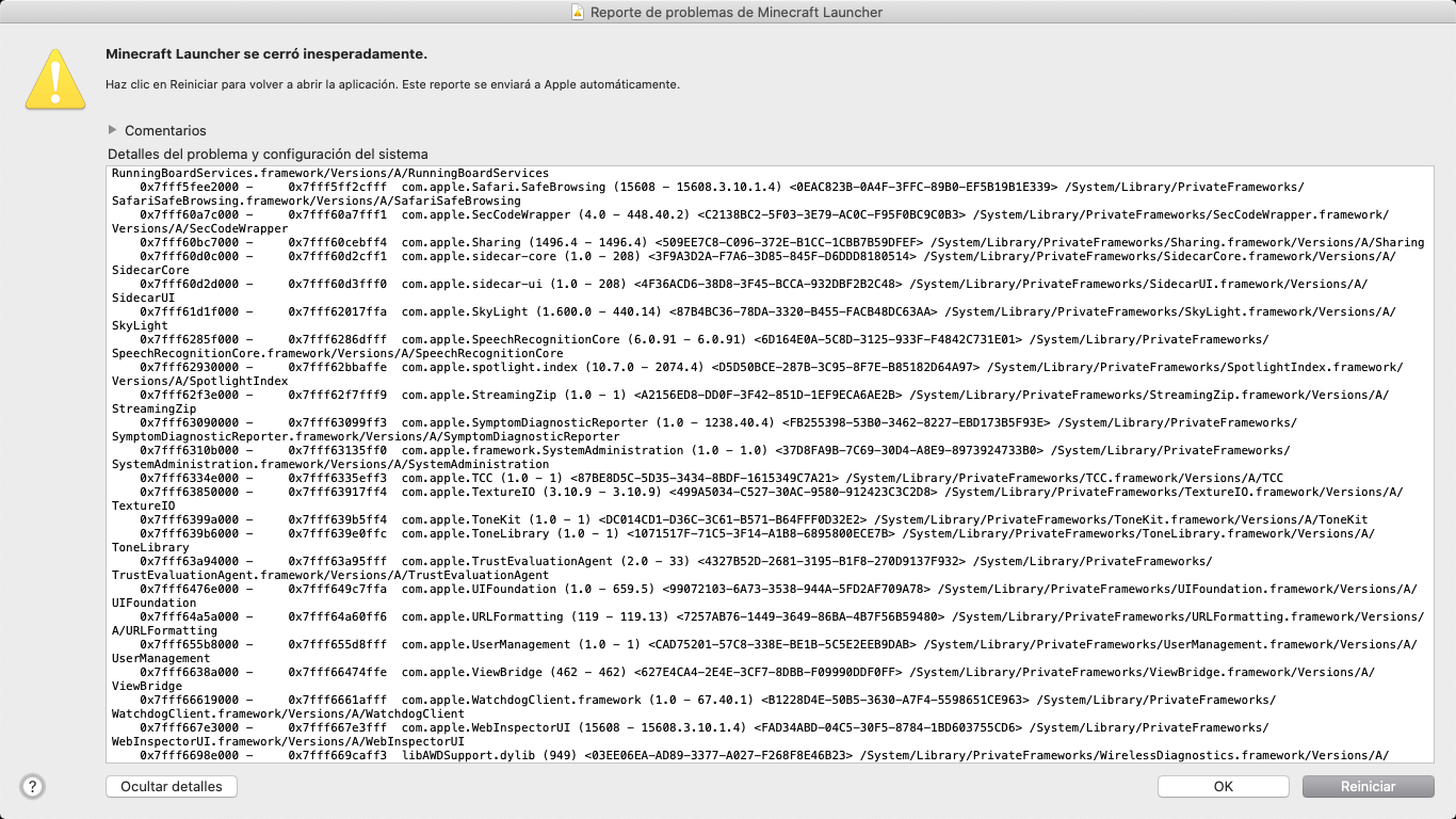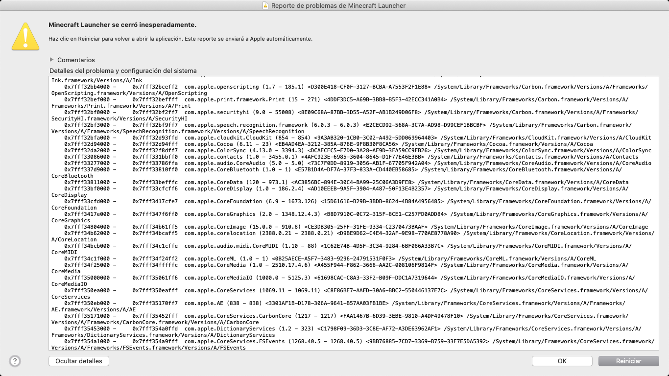 When I click on the official Minecraft icon to start playing, it appears me 'Minecraft closed suddenly' and I click on 'Restar' and it continues like that, so I can't play Minecraft. Here are some pictures, they're in Spanish soI'll translate them in English.