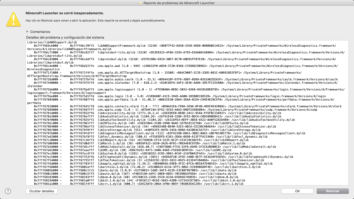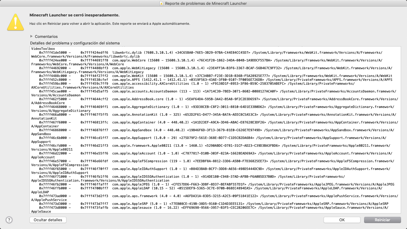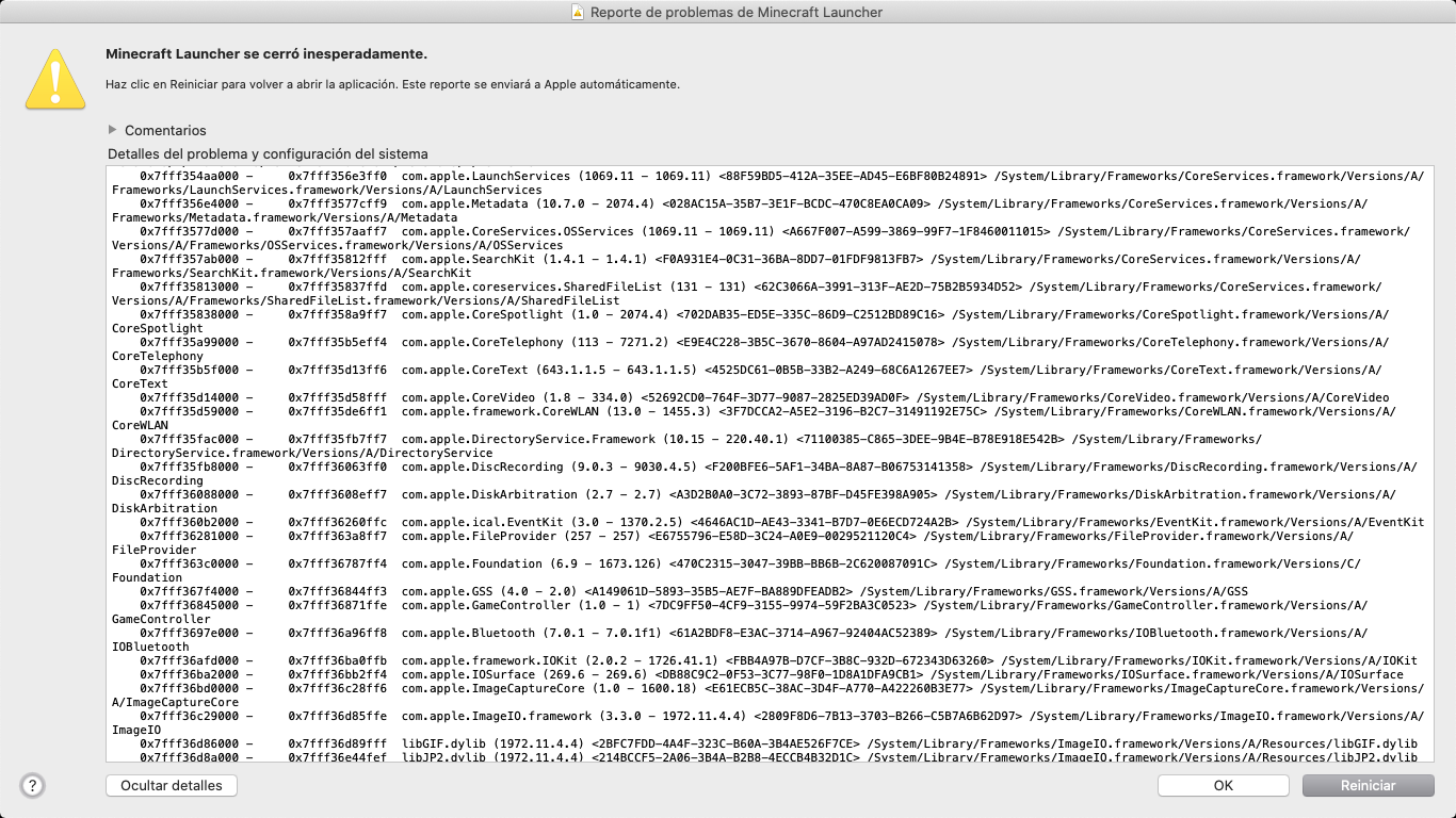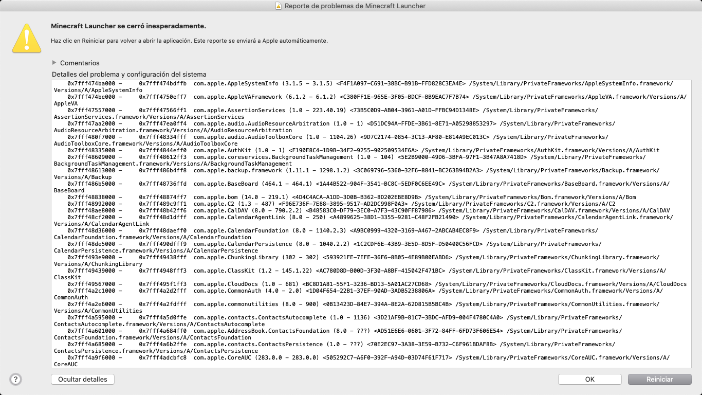 When I click on the official Minecraft icon to start playing, it appears me 'Minecraft closed suddenly' and I click on 'Restar' and it continues like that, so I can't play Minecraft. Here are some pictures, they're in Spanish soI'll translate them in English.