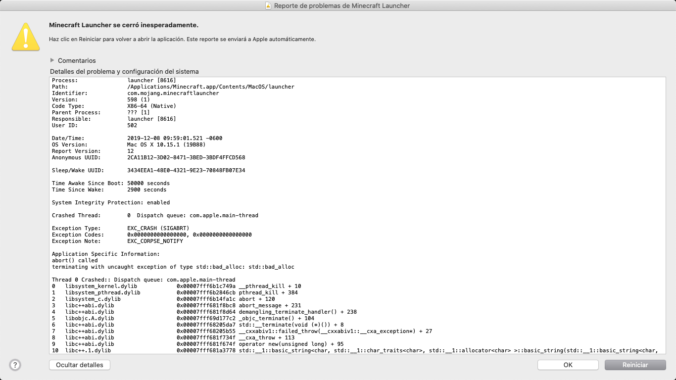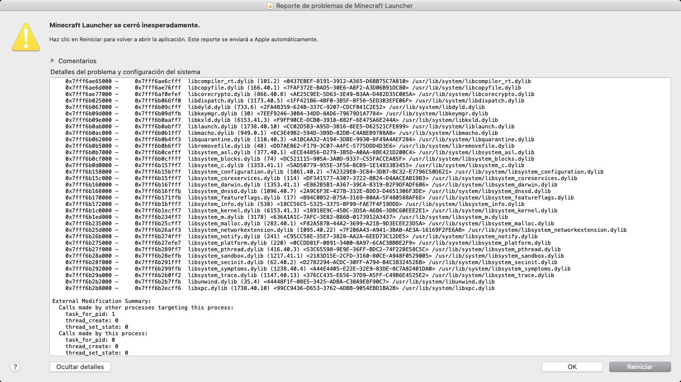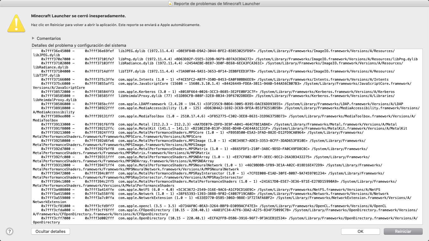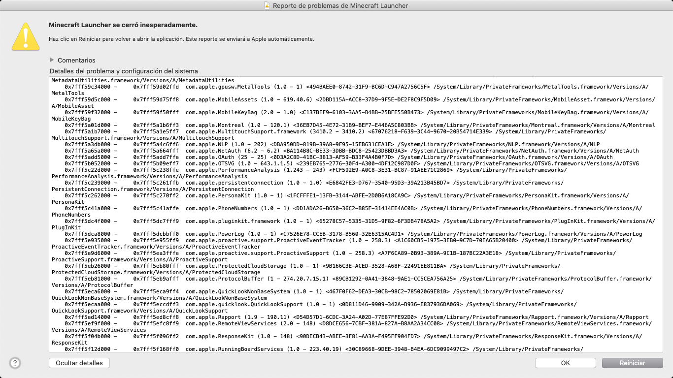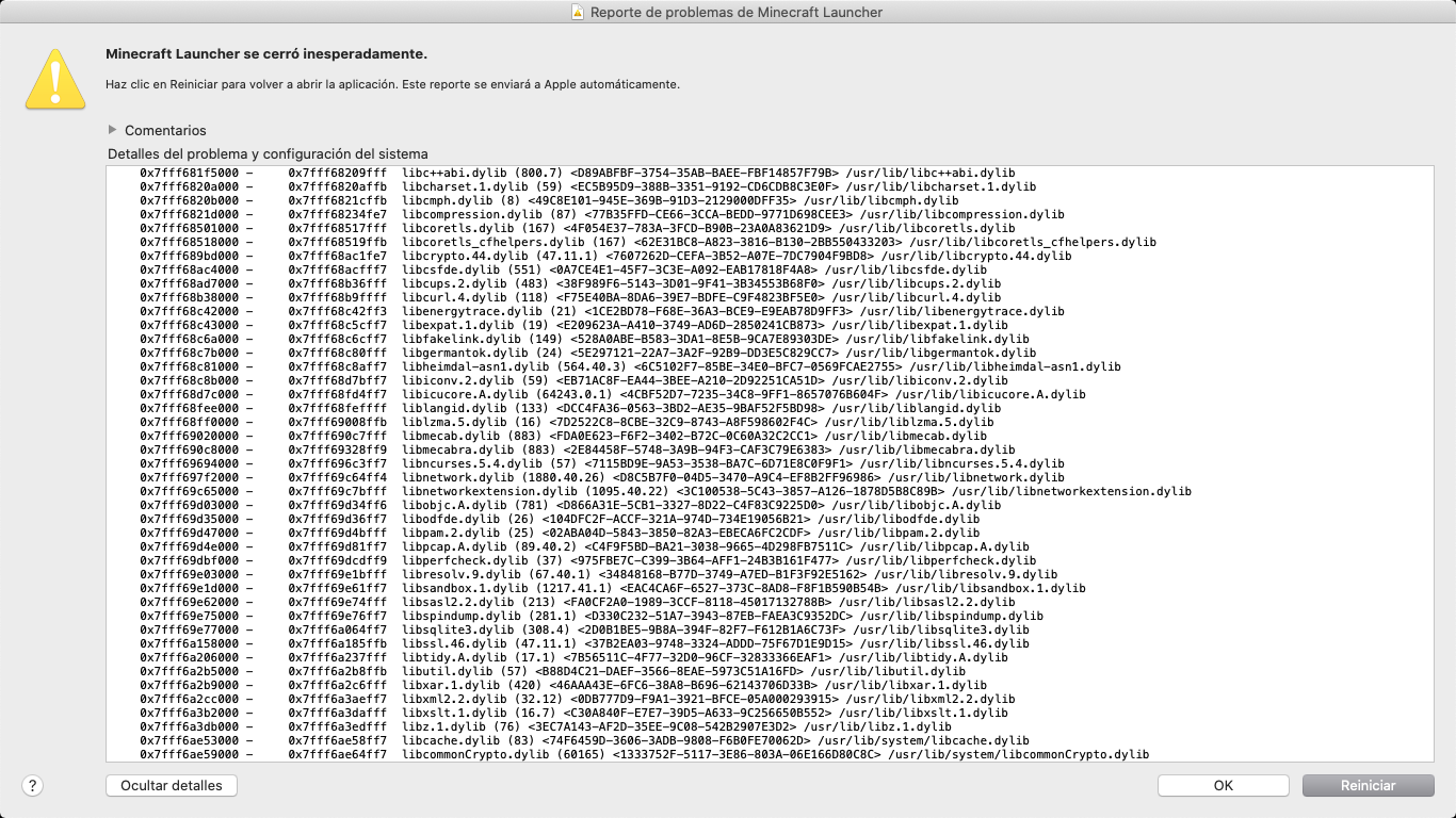 When I click on the official Minecraft icon to start playing, it appears me 'Minecraft closed suddenly' and I click on 'Restar' and it continues like that, so I can't play Minecraft. Here are some pictures, they're in Spanish soI'll translate them in English.