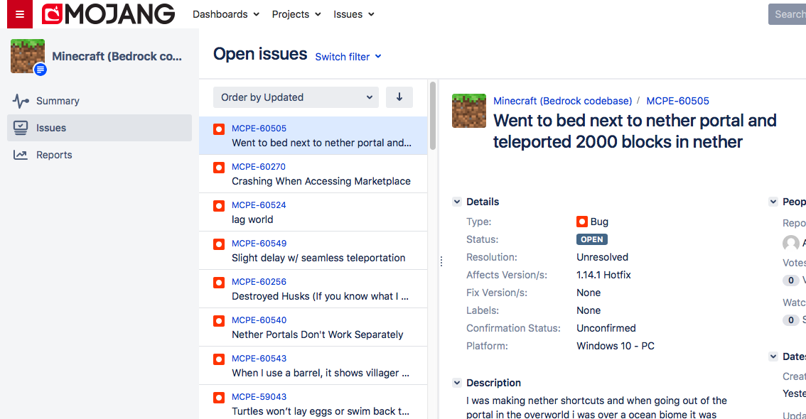 The link goes to https://bugs.mojang.com/projects/MCL/issues