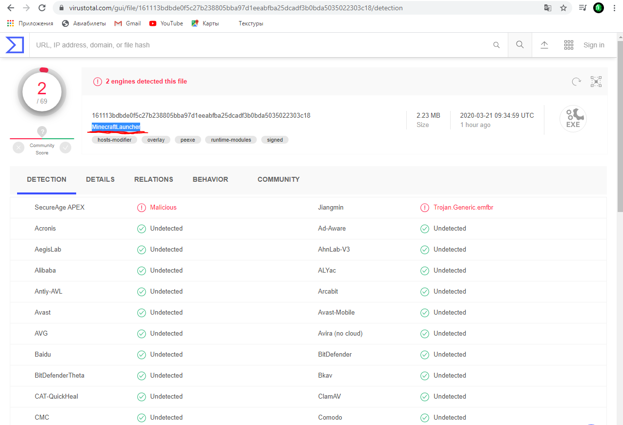 I recently had a virus on my computer, but I coped with it and the virustotal site helped me in this and I decided to scan minecraft for fun and was surprised. I’ll say right away that virustotal scans files with more than 50 antiviruses. and found that there was a trojan in the launcher of minecraft and the malware I was worried about this and I reinstalled minecraft and erased all its files not only the launcher but also the .minecraft folder and downloaded everything again and still there were viruses. what’s funny is that if you download the launcher but don’t open it and check it, then there will be other viruses.