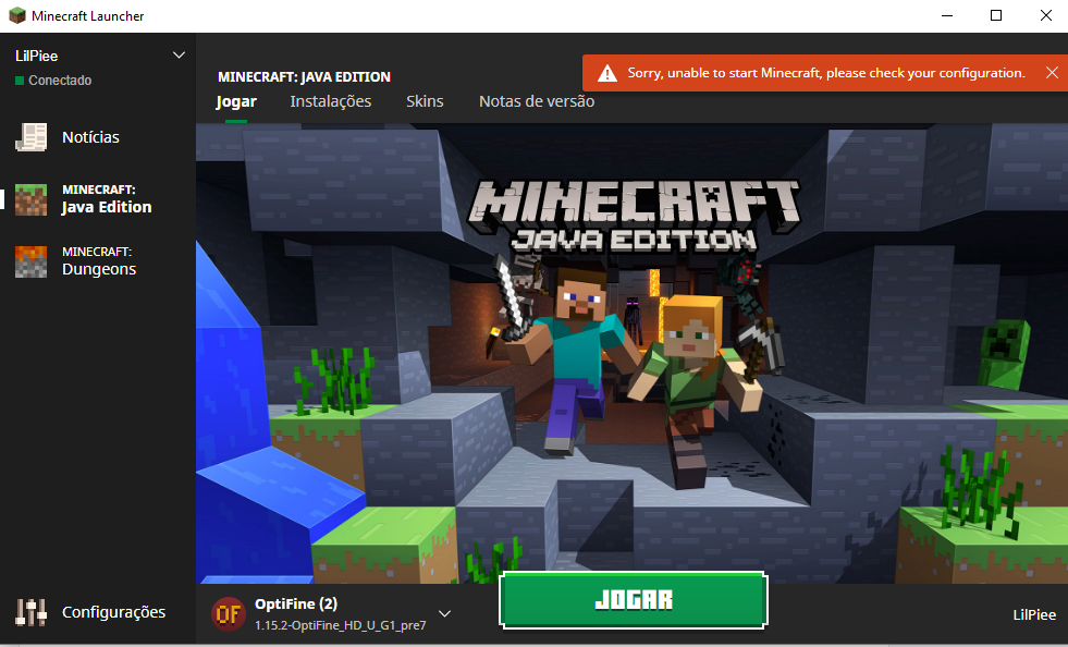 isso acontece comigo só quando eu inicio a versão 1.15.2 Optifine