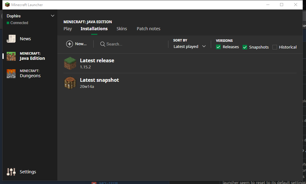 After an unexpected shutdown of my PC, while the game was launching, I turned it back on. After opening the launcher I found myself on the login screen. After logging into my account, all of my "installations" (versions) and accounts that I was logged in into were not there. The launcher seem to reset to its default settings. The skin library was still there though.