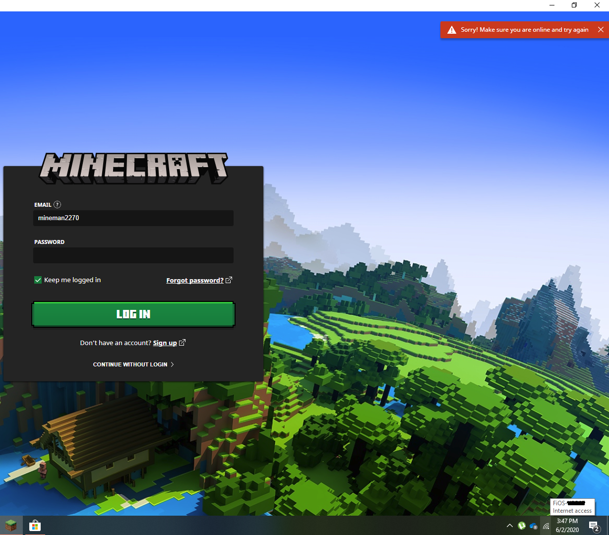 Minecraft: Sorry! Make sure you're online and try again.