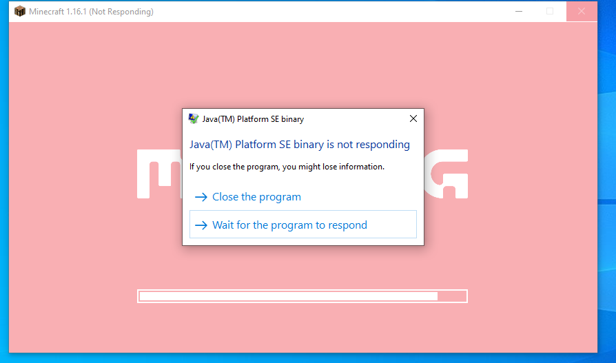 I click play in the launcher and it pulls up minecraft 1.16.1 but the bar stop filling at the end and the screen turns pale white and then i get a windows message that the game is not responding