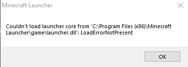 When i try to run the game launcher, i get 2 error messages. The first reads: Couldn't load launcher core from 'C:\Program Files (x86)\Minecraft Launcher\game\launcher.dll': LoadErrorNotPresent