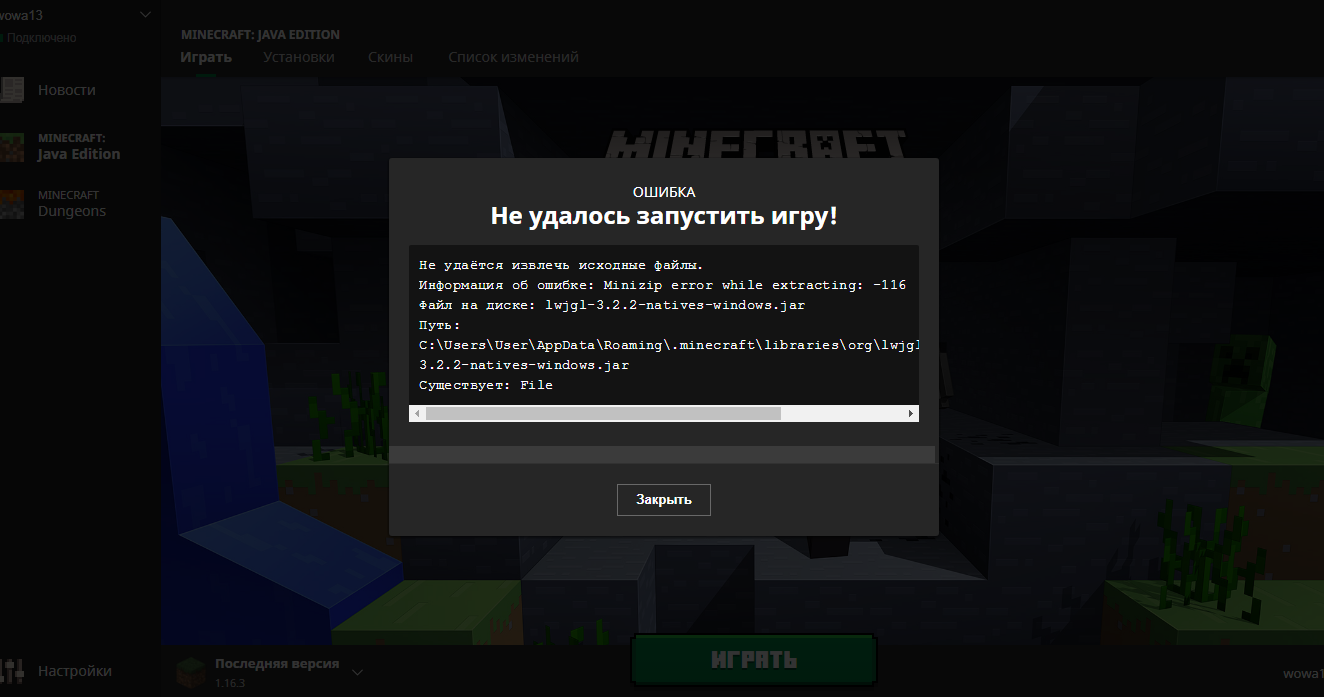 нет входа в игру 1.16.3
