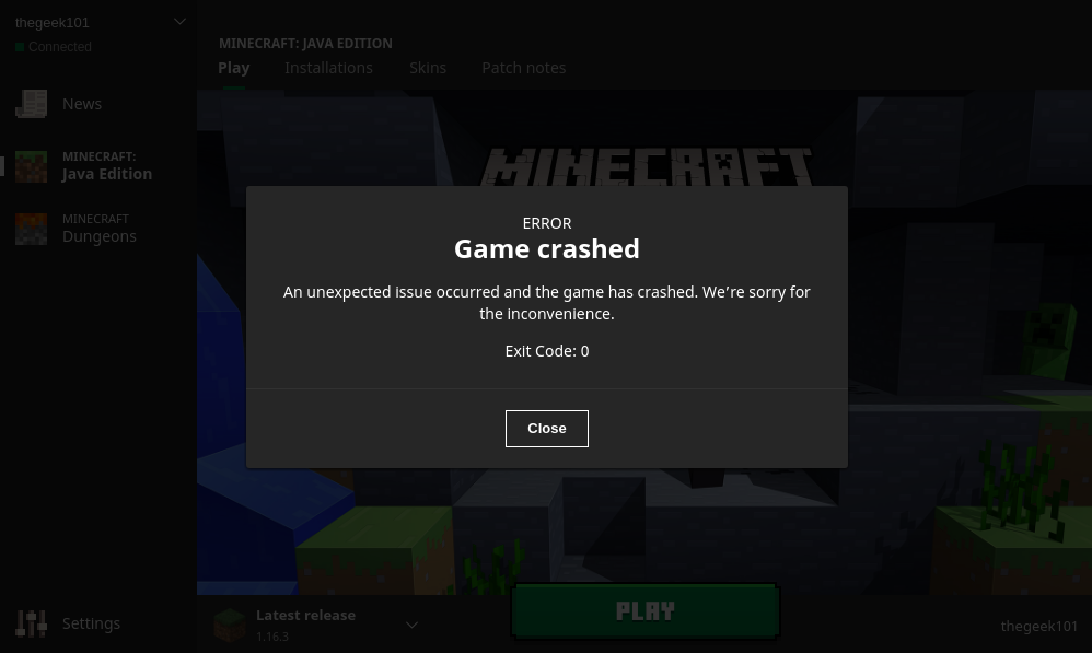 I installed Minecraft Java Edition on my Debian system and the launcher works well. However, when I try to launch the game, the launcher closes, nothing happens for a while, and then the launcher reopens with an error message and an Exit Code of 0. This is the official minecraft.deb file from minecraft.net/downloads/alternative, and yes I have a valid paid Minecraft account. Minecraft works perfectly (apart from a really loud fan XD) on my Macbook Pro. Can anyone tell me why this is happening?