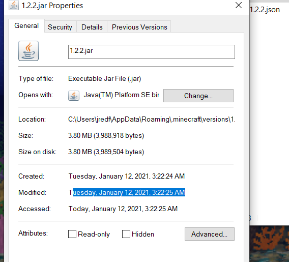 go to %appdata%/.minecraft/versions/1.2.2 notice the timestamp says 2020 on last modified instead of the timestamp on the json either from "releaseTime" or "time" It's suppose to say 2012 or something like that