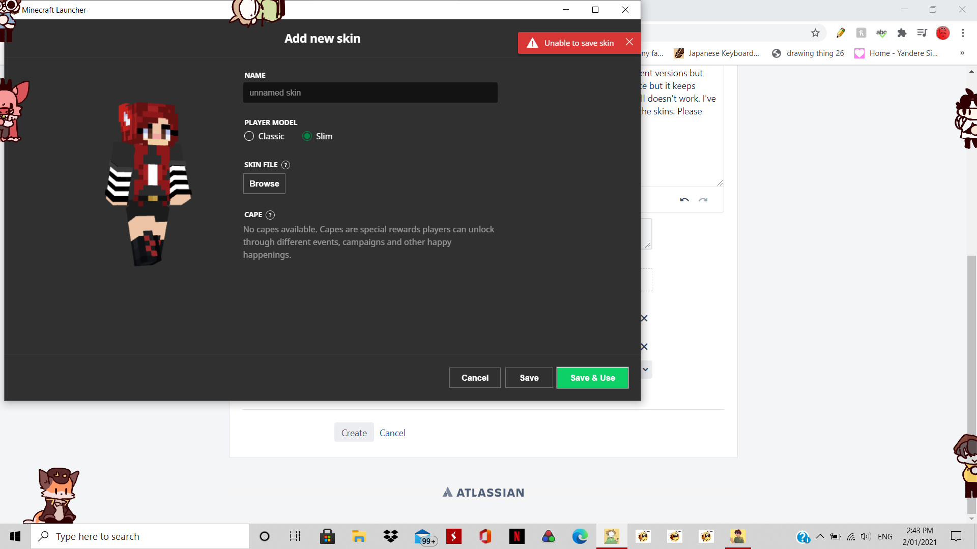 Hello! Every time I go onto my Minecraft launcher and try to use my skin I created, it says that it cant be saved and I cant use it or duplicate it. I've tried to change it on different versions but still nothing works. I've also tried to change it on the official Minecraft website but it keeps coming out as an Alex skin. I've tried a slim skin and a non-slim skin but it still doesn't work. I've downloaded it and tried it again but still, nothing. Also, I can't delete any of the skins. Please help :/