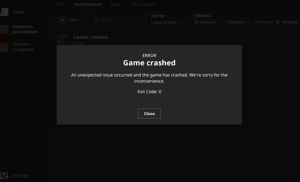 I am playing on a MacBook Air and I have all the default settings Vanilla Minecraft installed 3+ times with Java Arguments, Executable, Game Directory, And Version all being up to date and default but the game always Crashes with the message “ERROR - Game Crashed, an unexpected error has occurred and the game has crashed. Exit Code: 0”. I looked it up and it said you don’t need Java to run Minecraft on macs because of the built in Java with the newer launchers but I still have the latests Java 8 271 Update on the computer nonetheless. So really everything in the launcher works, Java is up to date and running, but the actual Minecraft game will not open for some reason. Please Help Mojang, I bought your game over a year ago and still haven’t been able to play it, and with all of the hype about Minecraft nowadays... I’m really feeling left out :/ Thanks