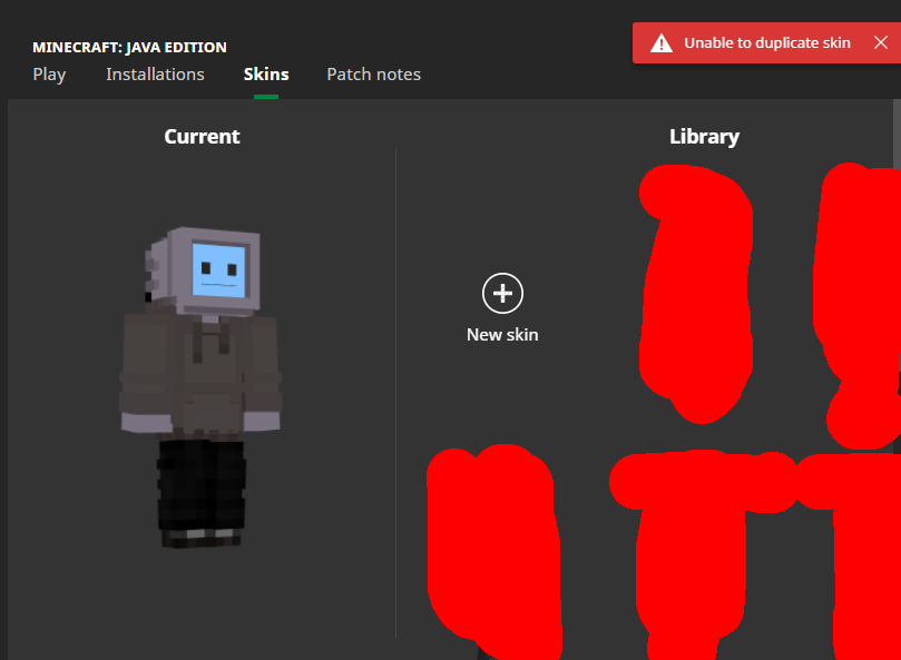 So I was working on a server of mine and I was trying to add skins to my NPCs. I uploaded a skin saved on my phone to my account via the Minecraft website. I went on the launcher to add the skin to my library, but I couldn't. There was an error saying "Unable to duplicate skin". This same error kept showing up any time I wanted to create or duplicate a skin, each error changing to what I was trying to do. I am unsure of why this happened, but I'm pretty sure it started after an update for the launcher.