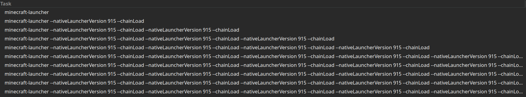 When I run minecraft-launcher in the terminal or from the app launcher, after instilling the launcher's files it endlessly opens new processes titled minecraft-launcher --nativeLauncherVersion 915 --chainLoad, with each new process having --nativeLauncherVersion 915 --chainLoad appended again. This never opens main launcher window, but starts using more and more CPU and RAM until I run killall -9 minecraft-launcher to close all the processes at once.