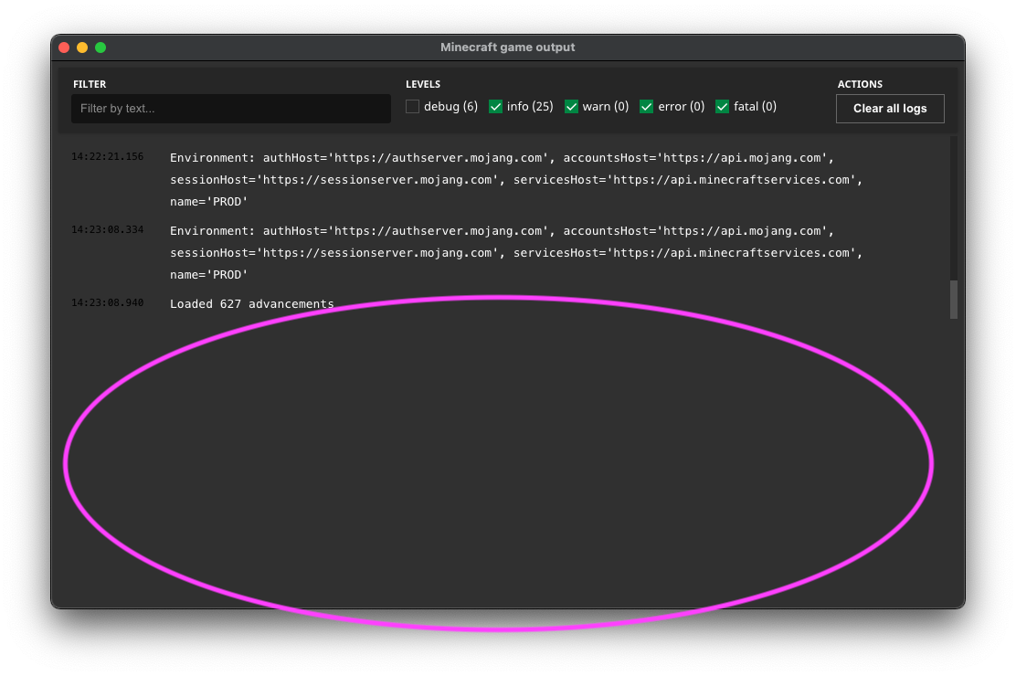 The launcher's output log window displays the output in a much smaller are than it did previously. In older versions, the output filled the entire output log window, as shown in this screenshot taken in 2.2.2310: