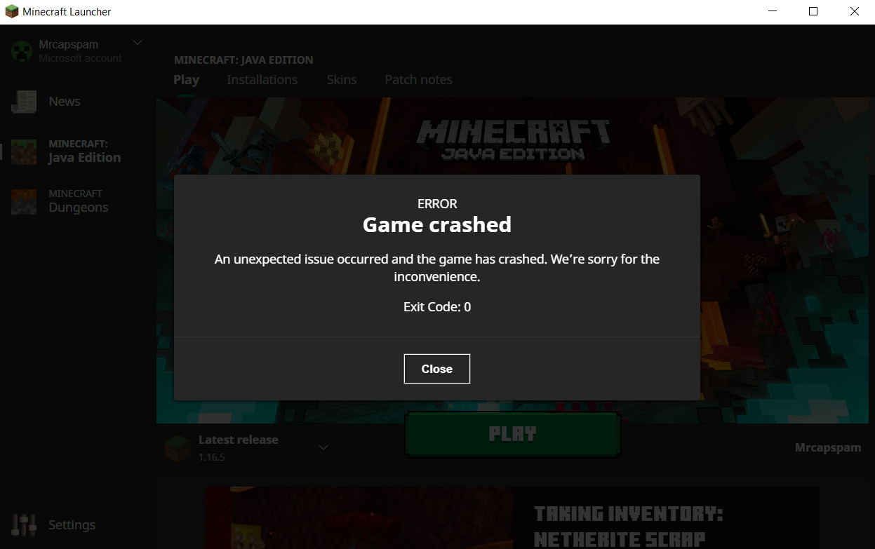 if i start the launcher and select a version from 1.0 to 1.16.5 and press start my minecraft game pops up and it says game chrashed. plss help mee