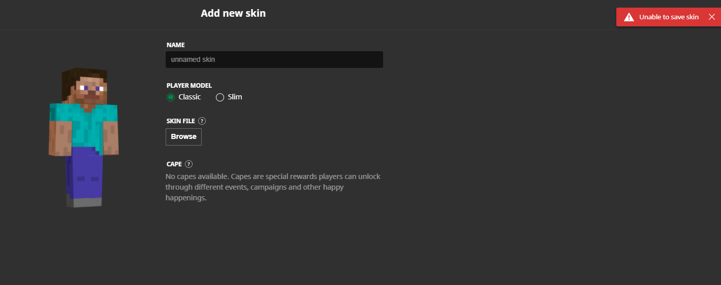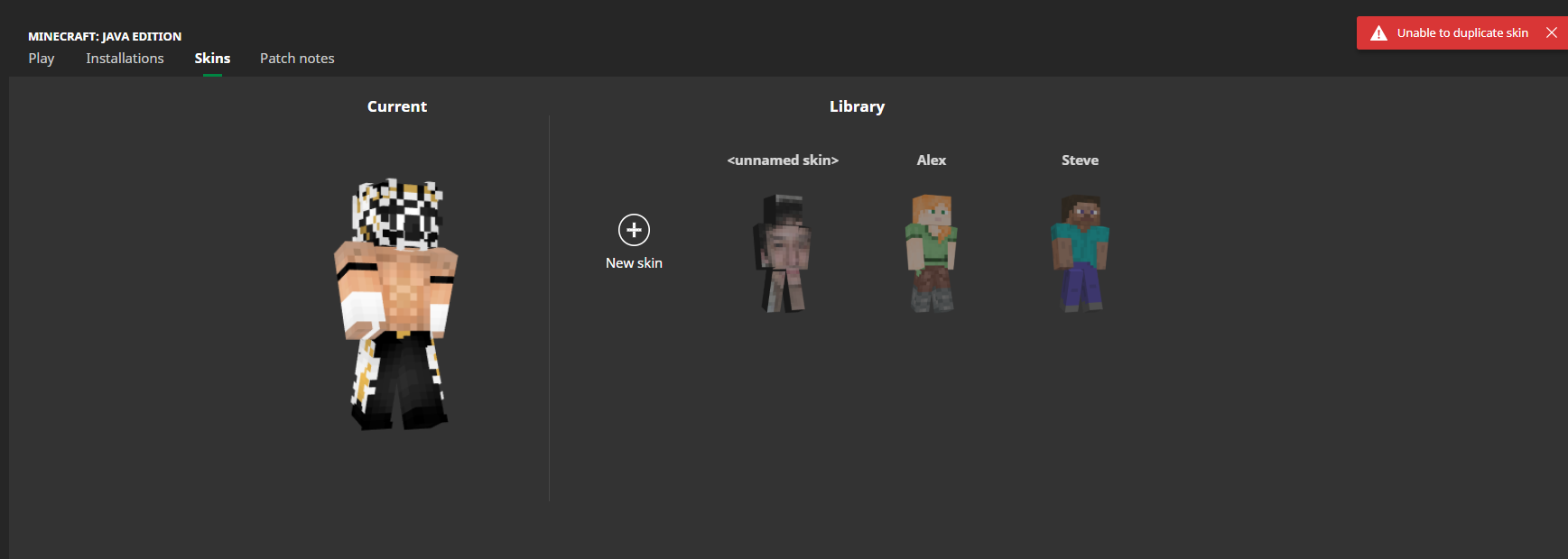 Upon trying to add a new skin to my library, an error message comes up saying "Unable to add skin to library", and whenever I try to save my current skin (which I added via minecraft.net), it says "Unable to duplicate skin" with no workaround I have found.