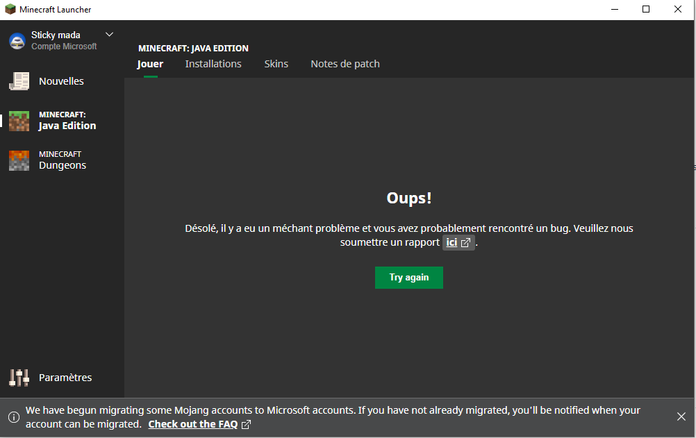 I purchased Minecraft a long long time ago and have now switched computers. When I go to where I should be able to open the new version on my new computer, the Minecraft Launcher tells me "sorry, something went terribly wrong and you probably encountered a bug" with no further information.
