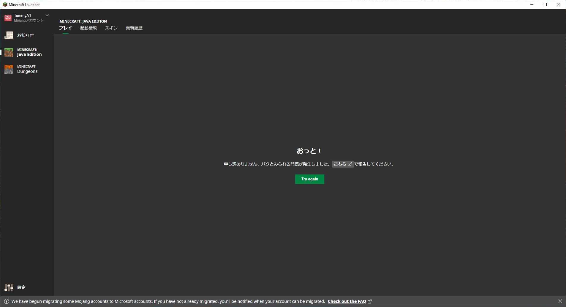 3. 3. When I started the game from the new launcher, a bug screen appeared and the game did not start