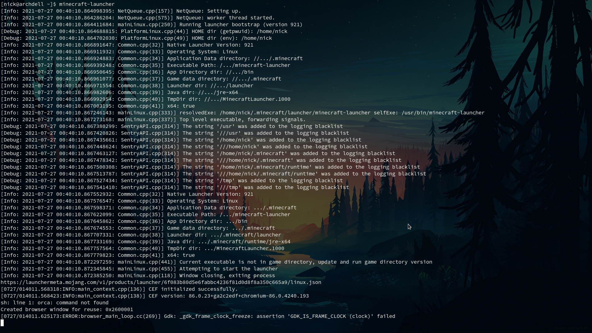 Attached is the terminal output when running minecraft-launcher. I have tried reinstalling the package and deleting/rebuilding all associated .json files, to no avail. No abnormalities are apparent in the launcher_accounts.json file, with "persistent" : true, as it should be, and a blank "userproperties" array. All other variables contain hex keys/hashes as normal.