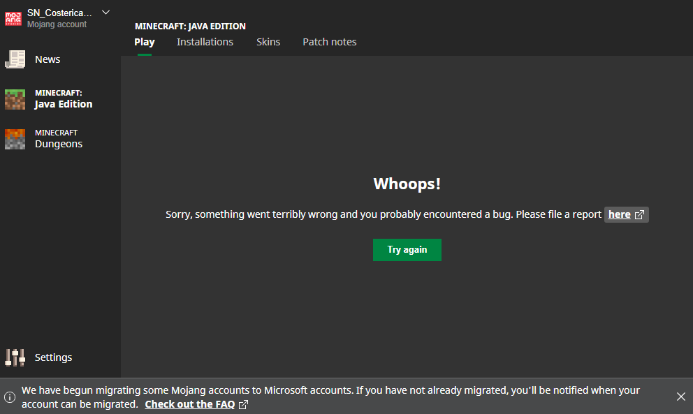 Just signed in onto my mojang account on this laptop of it is showing that i cannot play minecraft with a large. WHOOPS!!! in the middle of the screen not sure what to do.