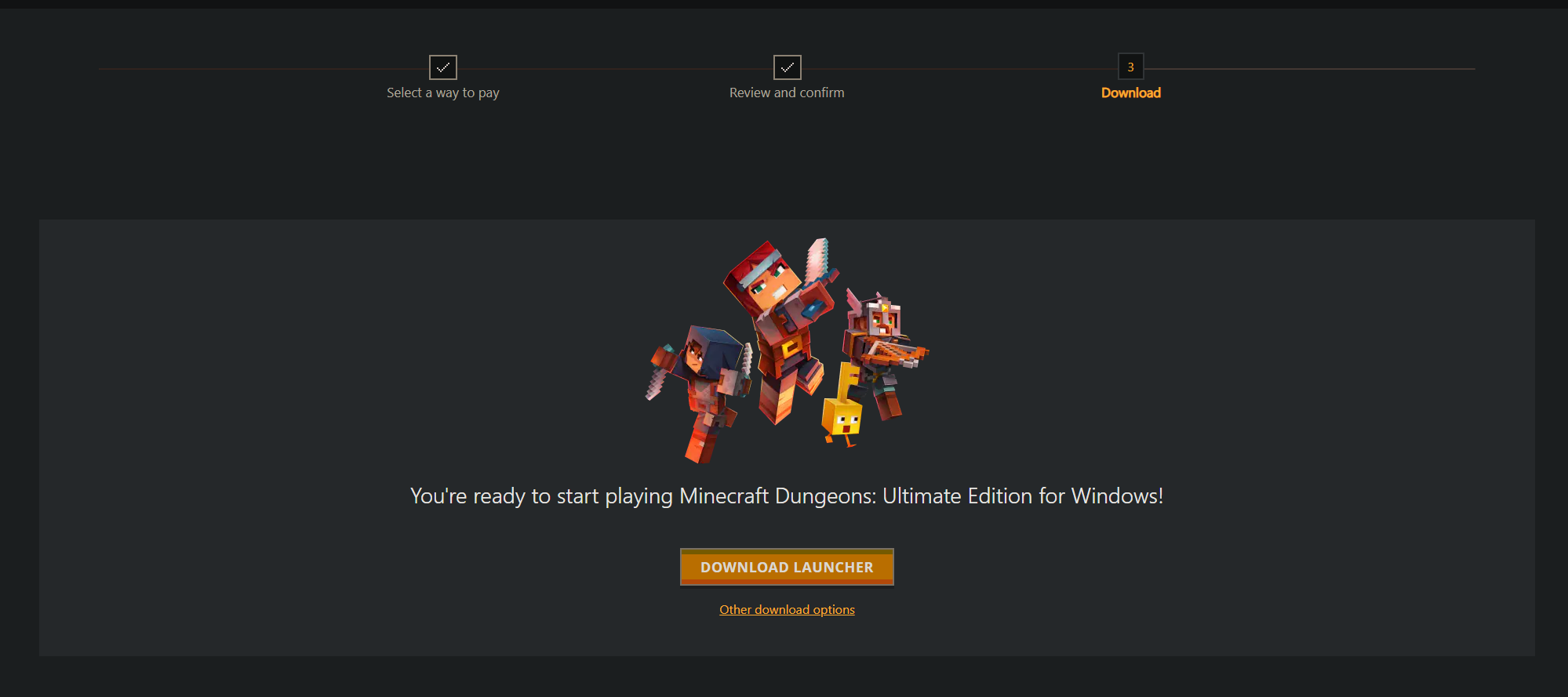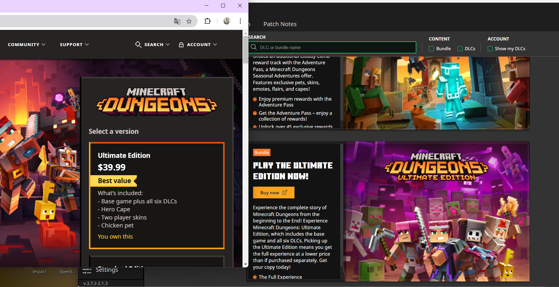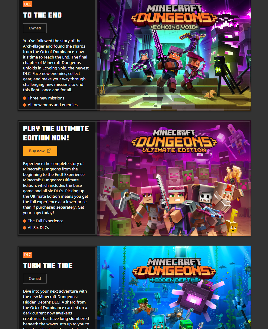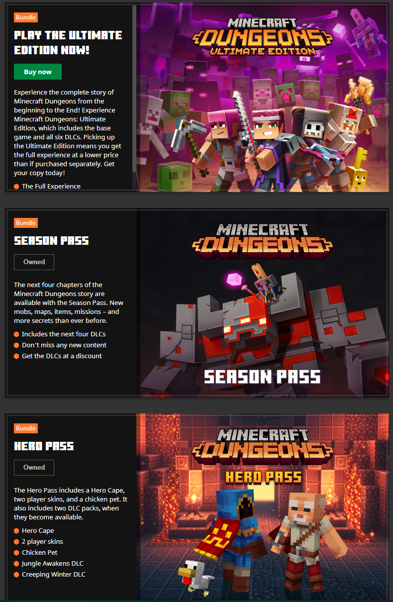 The Ultimate Edition bundle of Minecraft Dungeons does not show up as "Owned" in the DLC tab of the Launcher, despite the user already owning it.